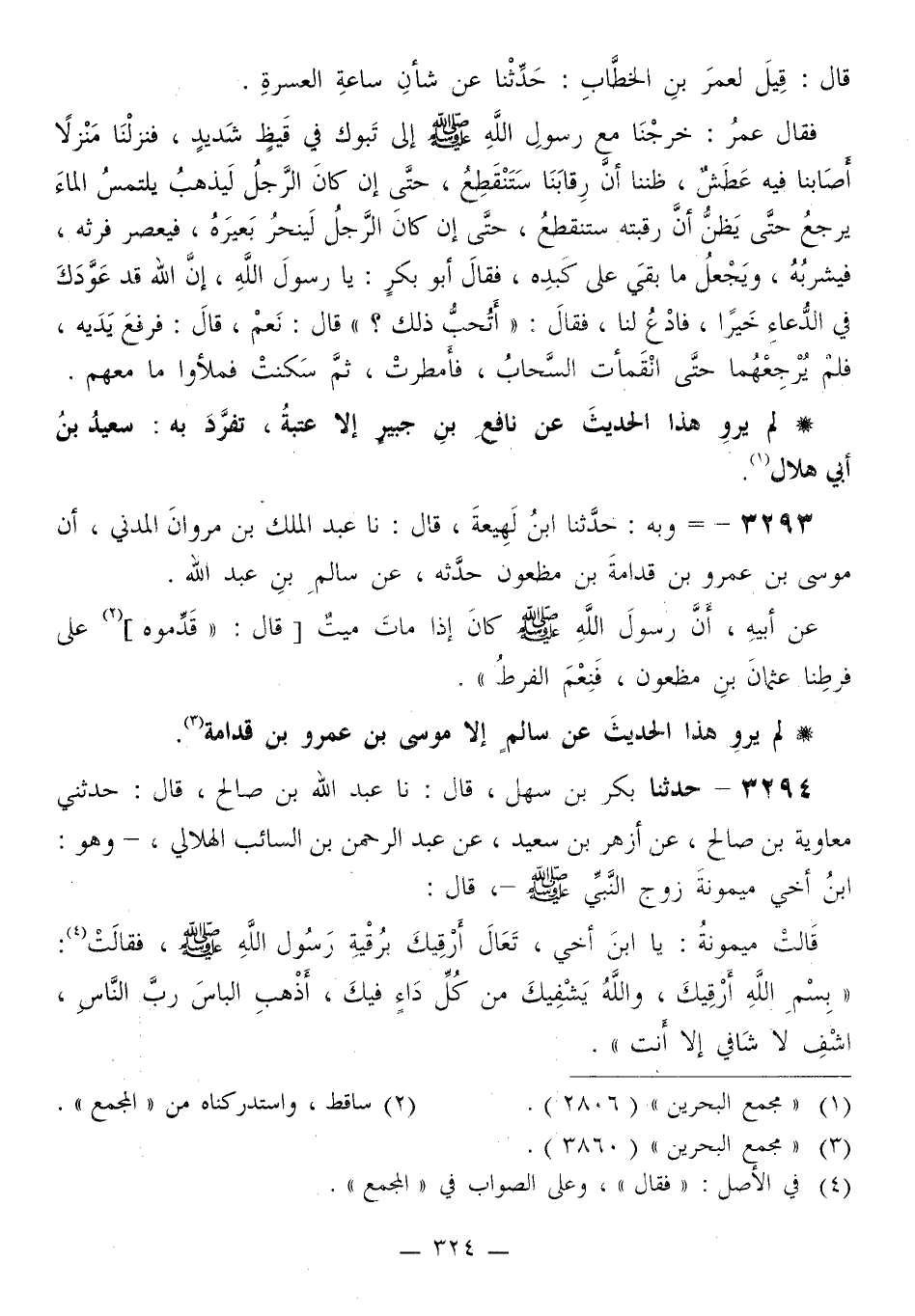 3293 - وَبِهِ حَدَّثَنَا ابْنُ لَهِيعَةَ قَالَ: نا عَبْدُ الْمَلِكِ بْنُ مَرْوَانَ الْمَدَنِيُّ، أَنَّ مُوسَى بْنَ عَمْرِو بْنِ قُدَامَةَ بْنِ مَظْعُونٍ، حَدَّثَهُ، عَنْ سَالِمِ بْنِ عَبْدِ اللَّهِ، عَنْ أَبِيهِ، أَنَّ رَسُولَ اللَّهِ صَلَّى اللهُ عَلَيْهِ وَسَلَّمَ كَانَ إِذَا مَاتَ مَيِّتٌ قَالَ: «§قَدِّمُوهُ عَلَى فَرَطِنَا عُثْمَانَ بْنِ مَظْعُونٍ، فَنِعْمَ الْفَرَطُ»