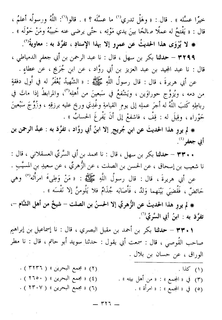 3299 - حَدَّثَنَا بَكْرُ بْنُ سَهْلٍ قَالَ: نَا عَبْدُ الرَّحْمَنِ بْنُ أَبِي جَعْفَرٍ الدِّمْيَاطِيُّ قَالَ: نَا عَبْدُ الْمَجِيدِ بْنُ عَبْدِ الْعَزِيزِ بْنِ أَبِي رَوَّادٍ، عَنِ ابْنِ جُرَيْجٍ، عَنْ عَطَاءٍ، عَنْ أَبِي هُرَيْرَةَ قَالَ: قَالَ رَسُولُ اللَّهِ صَلَّى اللهُ عَلَيْهِ وَسَلَّمَ: «§الشَّهِيدُ يُغْفَرُ لَهُ فِي أَوَّلِ دَفْقَةٍ مِنْ دَمِهِ، وَيُزَوَّجُ حَوْرَاوَيْنِ، وَيُشَفَّعُ فِي سَبْعِينَ مِنْ أَهْلِهِ، وَالْمُرابِطُ إِذَا مَاتَ فِي رِبَاطِهِ كَتَبَ اللَّهُ لَهُ أَجْرَ عَمَلِهِ إِلَى يَوْمِ الْقِيَامَةِ وَغُدِيَ وَرِيحَ عَلَيْهِ بِرِزْقِهِ، وَزُوِّجَ سَبْعِينَ حَوْرَاءَ، وَقِيلَ لَهُ: قِفْ، فَاشْفَعْ إِلَى أَنْ يَفْرُغَ الْحِسَابُ»