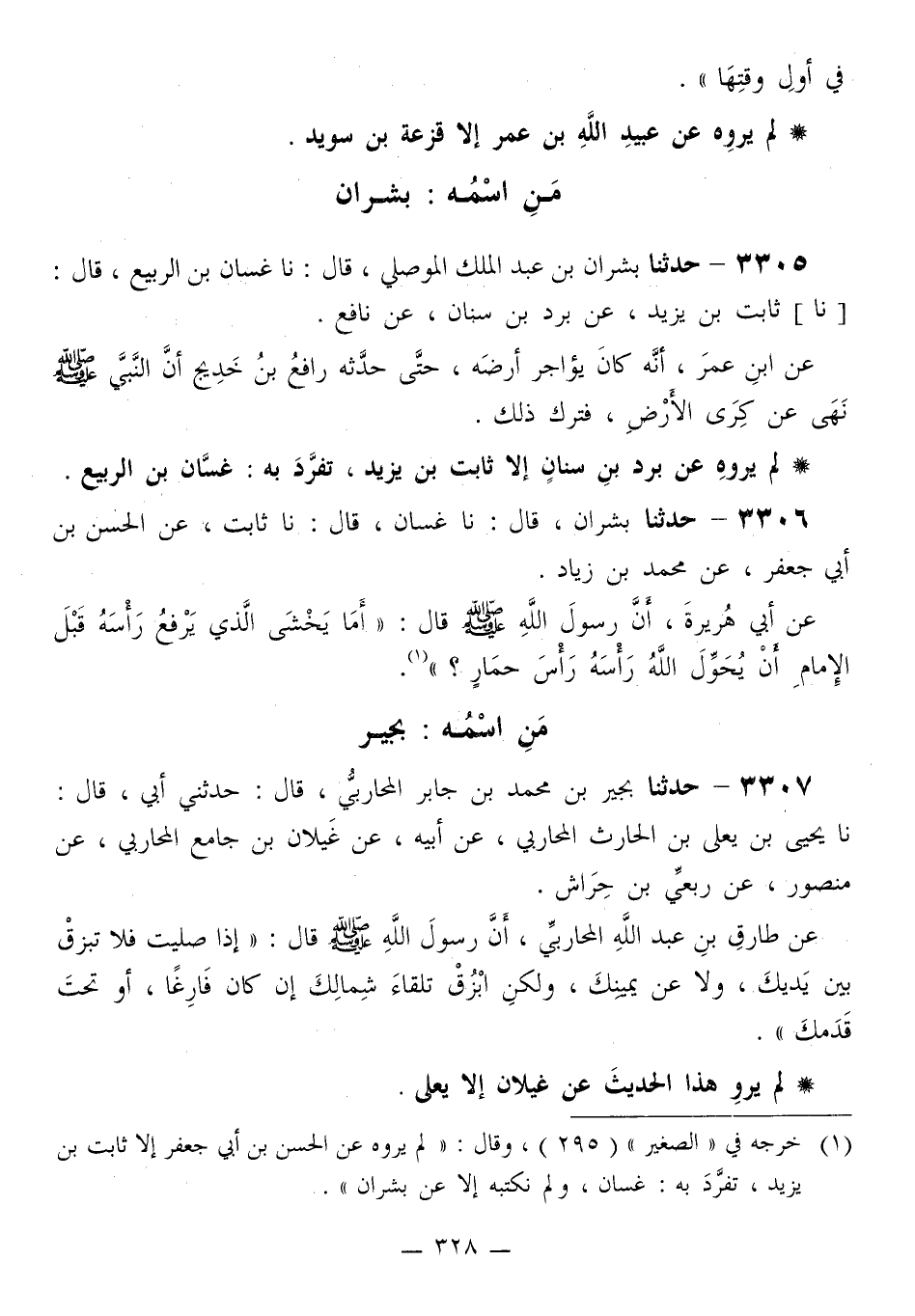 3305 - حَدَّثَنَا بُشْرَانُ بْنُ عَبْدِ الْمَلِكِ الْمَوْصِلِيُّ قَالَ: نَا غَسَّانُ بْنُ الرَّبِيعِ قَالَ: نَا ثَابِتُ بْنُ يَزِيدَ، عَنْ بُرْدِ بْنِ سِنَانٍ، عَنْ نَافِعٍ، عَنِ ابْنِ عُمَرَ، أَنَّهُ كَانَ يُؤَاجِرُ أَرْضَهُ، حَتَّى حَدَّثَهُ رَافِعُ بْنُ خَدِيجٍ «أَنَّ النَّبِيَّ صَلَّى اللهُ عَلَيْهِ وَسَلَّمَ §نَهَى عَنْ كَرْيِ الْأَرْضِ» ، فَتَرَكَ ذَلِكَ " لَمْ يَرْوهِ عَنْ بُرْدِ بْنِ سِنَانٍ إِلَّا ثَابِتُ بْنُ يَزِيدَ، تَفَرَّدَ بِهِ غَسَّانُ بْنُ الرَّبِيعِ