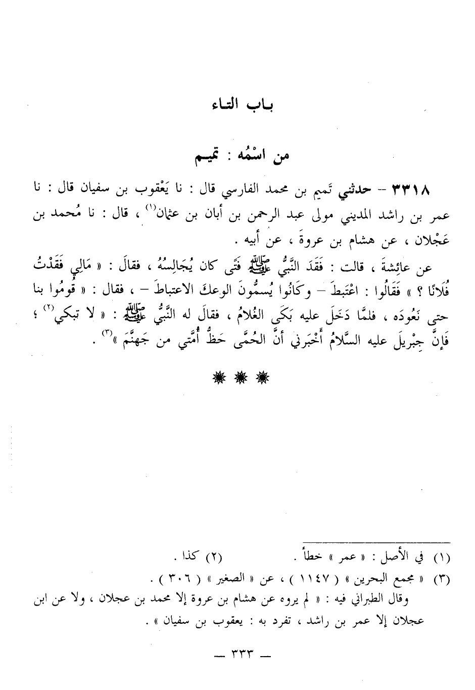 3318 - حَدَّثَنِي تَمِيمُ بْنُ مُحَمَّدٍ الْفَارِسِيُّ قَالَ: نَا يَعْقُوبُ بْنُ سُفْيَانَ قَالَ: نَا عُمَرُ بْنُ رَاشِدٍ الْمَدِينِيُّ، مَوْلَى عَبْدِ الرَّحْمَنِ بْنِ أَبَانَ بْنِ عُثْمَانَ قَالَ: نَا مُحَمَّدُ بْنُ عَجْلَانَ، عَنْ هِشَامِ بْنِ عُرْوَةَ، عَنْ أَبِيهِ، عَنْ عَائِشَةَ قَالَتْ: فَقَدَ النَّبِيُّ صَلَّى اللهُ عَلَيْهِ وَسَلَّمَ فَتًى كَانَ يُجَالِسُهُ، فَقَالَ: «مَالِي فَقَدْتُ فُلَانًا؟» فَقَالُوا: اعْتُبِطَ، وَكَانُوا يُسَمُّونَ الْوَعَكَ الِاعْتِبَاطَ، فَقَالَ: «قُومُوا بِنَا حَتَّى نَعُودَهُ» فَلَمَّا دَخَلَ عَلَيْهِ بَكَى الْغُلَامُ، فَقَالَ لَهُ النَّبِيُّ صَلَّى اللهُ عَلَيْهِ وَسَلَّمَ: «§لَا تَبْكِ، فَإِنَّ جِبْرِيلَ عَلَيْهِ السَّلَامُ أَخْبَرَنِي أَنَّ الْحُمَّى حَظُّ أُمَّتِي مِنْ جَهَنَّمَ»
