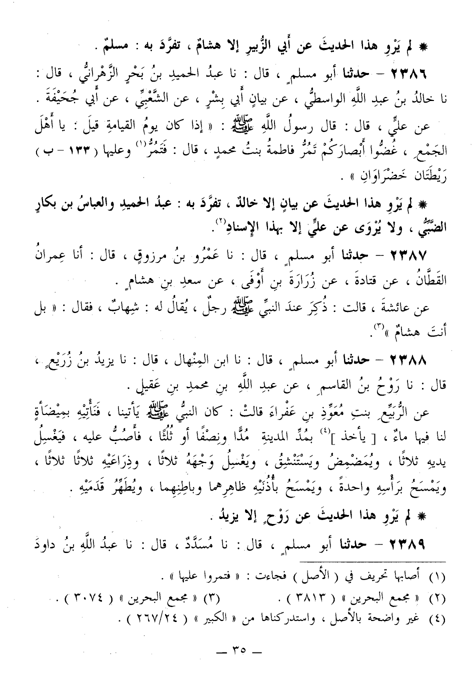 2386 - حَدَّثَنَا أَبُو مُسْلِمٍ قَالَ: نا عَبْدُ الْحَمِيدِ بْنُ بَحْرٍ الزَّهْرَانِيُّ قَالَ: نا خَالِدُ بْنُ عَبْدِ اللَّهِ الْوَاسِطِيُّ، عَنْ بَيَانٍ أَبِي بِشْرٍ، عَنِ الشَّعْبِيِّ، عَنْ أَبِي جُحَيْفَةَ، عَنْ عَلِيٍّ قَالَ: قَالَ رَسُولُ اللَّهِ صَلَّى اللهُ عَلَيْهِ وَسَلَّمَ: «§إِذَا كَانَ يَوْمُ الْقِيَامَةِ قِيلَ: يَا أَهْلَ الْجَمْعِ غَضُّوا أَبْصَارَكُمْ تَمُرُّ فَاطِمَةُ بِنْتُ مُحَمَّدٍ، قَالَ: فَتَمُرُّ وَعَلَيْهَا رَيْطَتَانِ خَضْرَاوَانِ»