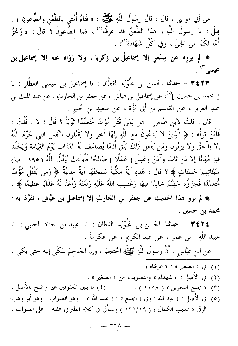 3423 - حَدَّثَنَا الْحَسَنُ بْنُ عَلَوِيَّةَ الْقَطَّانُ، نَا إِسْمَاعِيلُ بْنُ عِيسَى الْعَطَّارُ، نا مُحَمَّدُ بْنُ حُسَيْنٍ، عَنْ إِسْمَاعِيلَ بْنِ عَيَّاشٍ، عَنْ جَعْفَرِ بْنِ الْحَارِثِ، عَنْ عَبْدِ الْمَلِكِ بْنِ عَبْدِ الْعَزِيزِ، عَنِ الْقَاسِمِ بْنِ أَبِي بَزَّةَ، عَنْ سَعِيدِ بْنِ جُبَيْرٍ قَالَ: قُلْتُ لِابْنِ عَبَّاسٍ: هَلْ لِمَنْ قَتَلَ مُؤْمِنًا مُتَعَمِّدًا تَوْبَةٌ؟ قَالَ: لَا، قُلْتُ: فَأَيْنَ قَوْلُهُ: {§الَّذِينَ لَا يَدْعُونَ مَعَ اللَّهِ إِلَهًا آخَرَ وَلَا يَقْتُلُونَ النَّفْسَ الَّتِي حَرَّمَ اللَّهُ إِلَّا بِالْحَقِّ وَلَا يَزْنُونَ وَمَنْ يَفْعَلْ ذَلِكَ يَلْقَ أَثَامًا يُضَاعَفْ لَهُ الْعَذَابُ يَوْمَ الْقِيَامَةِ وَيَخْلُدْ فِيهِ مُهَانًا إِلَّا مَنْ تَابَ وَآمَنَ وَعَمِلَ عَمَلًا صَالِحًا فَأُولَئِكَ يُبَدِّلُ اللَّهُ سَيِّئَاتِهِمْ حَسَنَاتٍ} [الفرقان: 69] ؟ قَالَ: «هَذِهِ آيَةٌ مَكِّيَّةٌ نَسَخَتْهَا آيَةٌ مَدَنِيَّةٌ: {وَمَنْ يَقْتُلْ مُؤْمِنًا مُتَعَمِّدًا فَجَزَاؤُهُ جَهَنَّمُ خَالِدًا فِيهَا وَغَضِبَ اللَّهُ عَلَيْهِ وَلَعَنَهُ وَأَعَدَّ لَهُ عَذَابًا عَظِيمًا} [النساء: 93] »