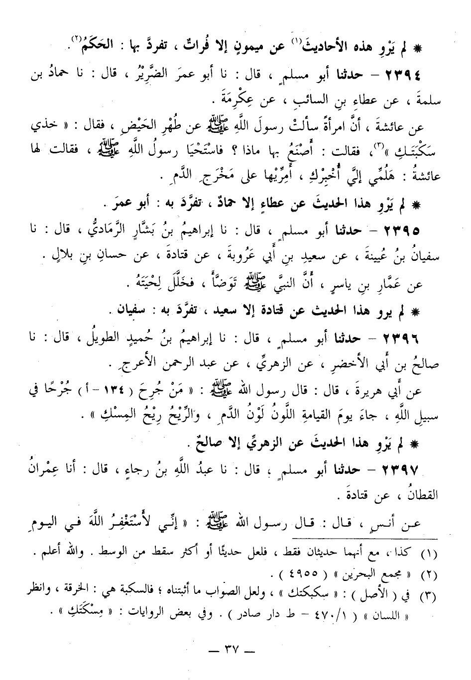 2397 - حَدَّثَنَا أَبُو مُسْلِمٍ قَالَ: نا عَبْدُ اللَّهِ بْنُ رَجَاءٍ قَالَ: أَنَا عِمْرَانُ الْقَطَّانُ، عَنْ قَتَادَةَ، عَنْ أَنَسٍ قَالَ: قَالَ رَسُولُ اللَّهِ صَلَّى اللهُ عَلَيْهِ وَسَلَّمَ: «§إِنِّي لَأَسْتَغْفِرُ اللَّهَ فِي الْيَوْمِ -[38]- سَبْعِينَ مَرَّةً»