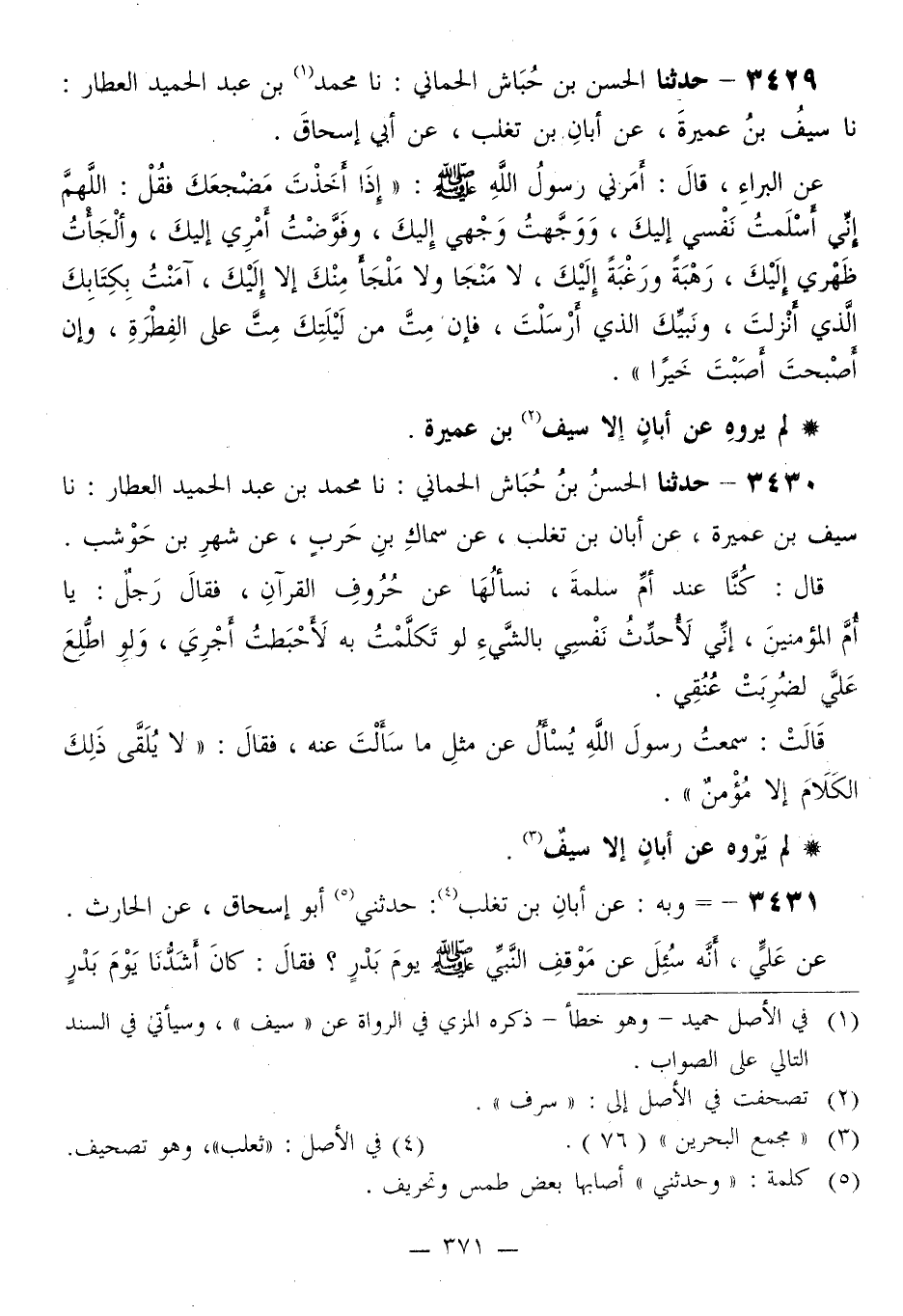 3429 - حَدَّثَنَا الْحَسَنُ بْنُ حُبَاشٍ الْحِمَّانِيُّ، نَا مُحَمَّدُ بْنُ عَبْدِ الْحَمِيدِ الْعَطَّارُ، نَا سَيْفُ بْنُ عَمِيرَةَ، عَنْ أَبَانَ بْنِ تَغْلِبَ، عَنْ أَبِي إِسْحَاقَ، عَنِ الْبَرَاءِ قَالَ: «أَمَرَنِي رَسُولُ اللَّهِ صَلَّى اللهُ عَلَيْهِ وَسَلَّمَ: §إِذَا أَخَذْتَ مَضْجَعَكَ فَقُلْ: اللَّهُمَّ إِنِّي أَسْلَمْتُ نَفْسِي إِلَيْكَ، وَوَجَّهْتُ وَجْهِي إِلَيْكَ، وَفَوَّضْتُ أَمْرِي إِلَيْكَ، وَأَلْجَأَتُ ظَهْرِي إِلَيْكَ، رَهْبَةً وَرَغْبَةً إِلَيْكَ، لَا مَنْجَا وَلَا مَلْجَأَ مِنْكَ إِلَّا إِلَيْكَ، آمَنْتُ بِكِتَابِكَ الَّذِي أَنْزَلْتَ، وَنَبِيِّكَ الَّذِي أَرْسَلْتَ، فَإِنْ مِتَّ مِنْ لَيْلَتِكَ مِتَّ عَلَى الْفِطْرَةِ، وَإِنْ أَصْبَحْتَ أَصَبْتَ خَيْرًا»