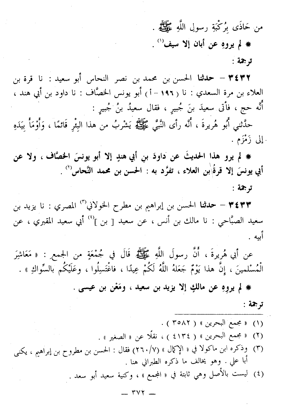 3432 - حَدَّثَنَا الْحَسَنُ بْنُ مُحَمَّدِ بْنِ نَصْرٍ النَّحَّاسُ أَبُو سَعِيدٍ، نَا قُرَّةُ بْنُ الْعَلَاءِ بْنِ مُرَّةَ السَّعْدِيُّ، نَا أَبُو يُونُسَ الْخَصَّافُ، نَا دَاوُدُ بْنُ أَبِي هِنْدٍ، أَنَّهُ حَجَّ، فَأَتَى سَعِيدَ بْنَ جُبَيْرٍ، فَقَالَ: سَعِيدُ بْنُ جُبَيْرٍ: حَدَّثَنِي أَبُو هُرَيْرَةَ، أَنَّهُ رَأَى النَّبِيَّ صَلَّى اللهُ عَلَيْهِ وَسَلَّمَ §يَشْرَبُ مِنْ هَذَا الْبِئْرِ قَائِمًا، وَأَوْمَأَ بِيَدِهِ إِلَى زَمْزَمَ. لَمْ يَرْوِ هَذَا الْحَدِيثَ عَنْ دَاوُدَ بْنِ أَبِي هِنْدٍ إِلَّا أَبُو يُونُسُ الْخَصَّافُ، وَلَا عَنْ أَبِي يُونُسَ أَلَا قُرَّةُ بْنُ الْعَلَاءِ، تَفَرَّدَ بِهِ الْحَسَنُ بْنُ مُحَمَّدٍ النُّحَاسُ تَرْجَمَةٌ