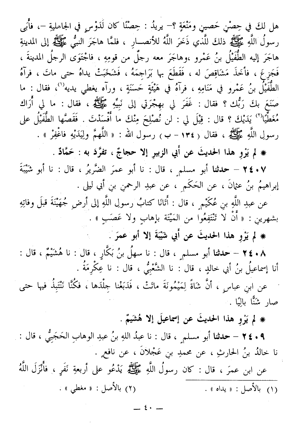 2409 - حَدَّثَنَا أَبُو مُسْلِمٍ قَالَ: نا عَبْدُ اللَّهِ بْنُ عَبْدِ الْوَهَّابِ الْحَجَبِيُّ قَالَ: نا خَالِدُ بْنُ الْحَارِثِ، عَنْ مُحَمَّدِ بْنِ عَجْلَانَ، عَنْ نَافِعٍ، عَنِ ابْنِ عُمَرَ قَالَ: «§كَانَ رَسُولُ اللَّهِ صَلَّى اللهُ عَلَيْهِ وَسَلَّمَ يَدْعُو عَلَى أَرْبَعَةِ نَفَرٍ، فَأَنْزَلَ اللَّهُ -[41]- عَزَّ وَجَلَّ» : {لَيْسَ لَكَ مِنَ الْأَمْرِ شَيْءٌ أَوْ يَتُوبَ عَلَيْهِمْ أَوْ يُعَذِّبَهُمْ فَإِنَّهُمْ ظَالِمُونَ} [آل عمران: 128] «فَهَدَاهُمُ اللَّهُ إِلَى الْإِسْلَامِ»
