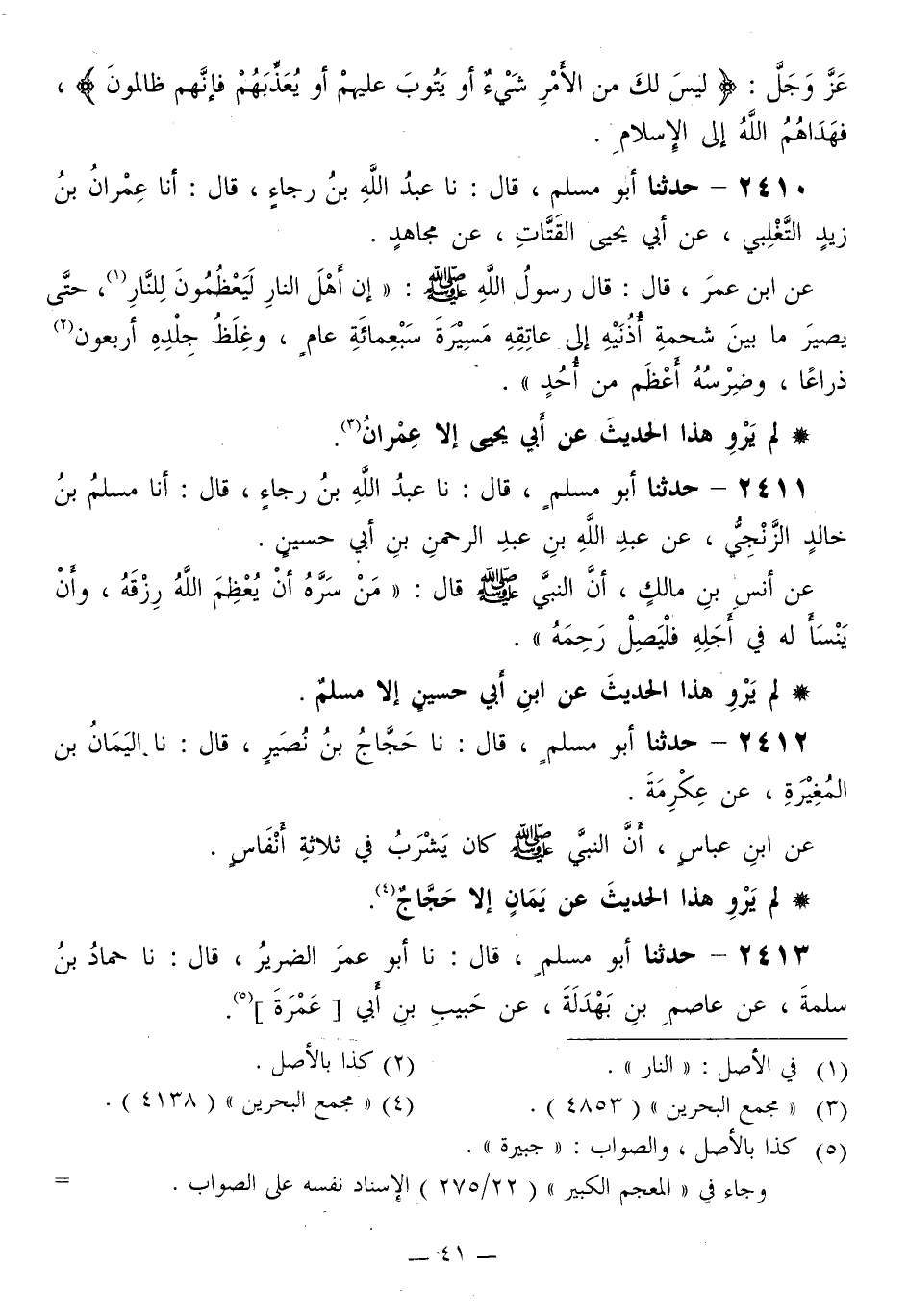 2410 - حَدَّثَنَا أَبُو مُسْلِمٍ قَالَ: نا عَبْدُ اللَّهِ بْنُ رَجَاءٍ قَالَ: أَنَا عِمْرَانُ بْنُ زَيْدٍ التَّغْلِبِيُّ، عَنْ أَبِي يَحْيَى الْقَتَّاتِ، عَنْ مُجَاهِدٍ، عَنِ ابْنِ عُمَرَ قَالَ: قَالَ رَسُولُ اللَّهِ صَلَّى اللهُ عَلَيْهِ وَسَلَّمَ: «إِنَّ §أَهْلَ النَّارِ لَيَعْظُمُونَ لِلنَّارِ، حَتَّى يَصِيرَ مَا بَيْنَ شَحْمَةِ أُذُنَيْهِ إِلَى عَاتِقِهِ مَسِيرَةَ سَبْعِمِائَةِ عَامٍ، وَغِلَظُ جِلْدِهِ أَرْبَعِينَ ذِرَاعًا، وضِرْسُهُ أَعْظَمَ مِنْ أُحُدٍ»