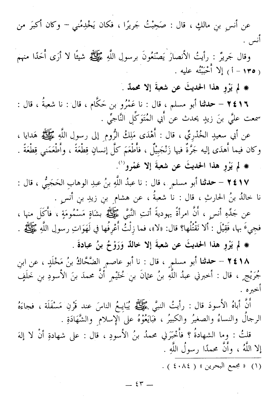 وَقَالَ جَرِيرٌ: §رَأَيْتُ الْأَنْصَارَ يَصْنَعُونَ بِرَسُولِ اللَّهِ صَلَّى اللهُ عَلَيْهِ وَسَلَّمَ شَيْئًا لَا أَرَى أَحَدًا مِنْهُمْ إِلَّا أَحْبَبْتُهُ عَلَيْهِ لَمْ يَرْوِ هَذَا الْحَدِيثَ عَنْ شُعْبَةَ إِلَّا مُحَمَّدٌ