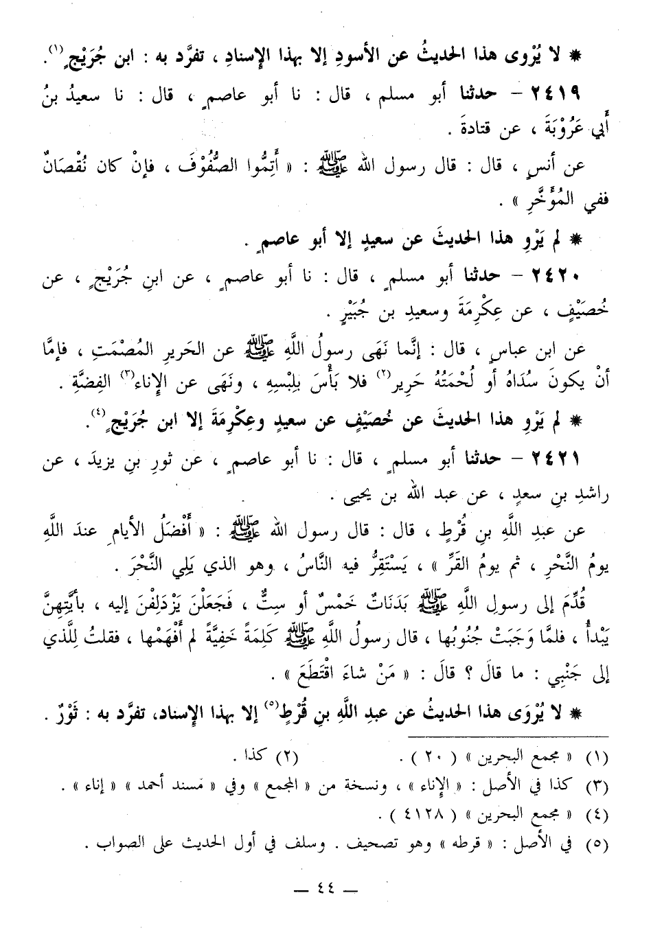 2421 - حَدَّثَنَا أَبُو مُسْلِمٍ قَالَ: نا أَبُو عَاصِمٍ، عَنْ ثَوْرِ بْنِ يَزِيدَ، عَنْ رَاشِدِ بْنِ سَعْدٍ، عَنْ عَبْدِ اللَّهِ بْنِ يَحْيَى، عَنْ عَبْدِ اللَّهِ بْنِ قُرْطٍ قَالَ: قَالَ رَسُولُ اللَّهِ صَلَّى اللهُ عَلَيْهِ وَسَلَّمَ: «§أَفْضَلُ الْأَيَّامِ عِنْدَ اللَّهِ يَوْمُ النَّحْرِ، ثُمَّ يَوْمُ الْقَرِّ» يَسْتَقِرُّ فِيهِ النَّاسُ، وَهُوَ الَّذِي يَلِي النَّحْرَ، قُدِّمَ إِلَى رَسُولِ اللَّهِ صَلَّى اللهُ عَلَيْهِ وَسَلَّمَ بَدَنَاتٌ خَمْسٌ أَوْ سِتٌّ، فَجَعَلْنَ يَزْدَلِفْنَ إِلَيْهِ، بِأَيَّتِهِنَّ يَبْدَأُ، فَلَمَّا وَجَبَتْ جُنُوبُهَا، قَالَ رَسُولُ اللَّهِ صَلَّى اللهُ عَلَيْهِ وَسَلَّمَ كَلِمَةً خَفِيَّةً لَمْ أَفْهَمْهَا، فَقُلْتُ لِلَّذِي إِلَى جَنْبِي: مَا قَالَ؟ قَالَ: «مَنْ شَاءَ اقْتَطَعَ»