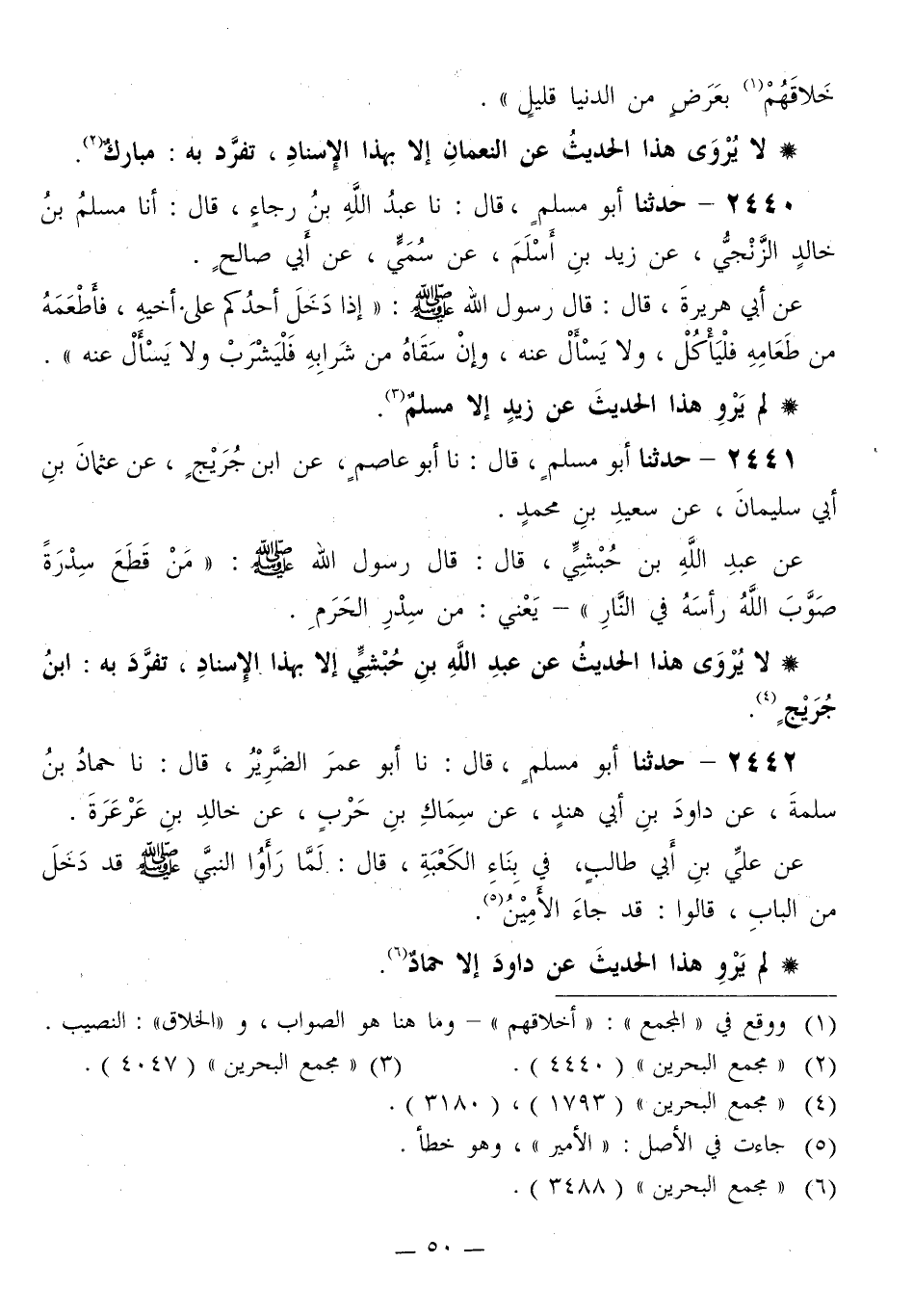 2440 - حَدَّثَنَا أَبُو مُسْلِمٍ قَالَ: نا عَبْدُ اللَّهِ بْنُ رَجَاءٍ قَالَ: أََنَا مُسْلِمُ بْنُ خَالِدٍ الزَّنْجِيُّ، عَنْ زَيْدِ بْنِ أَسْلِمَ، عَنْ سُمَيٍّ، عَنْ أَبِي صَالِحٍ، عَنْ أَبِي هُرَيْرَةَ قَالَ: قَالَ رَسُولُ اللَّهِ صَلَّى اللهُ عَلَيْهِ وَسَلَّمَ: «§إِذَا دَخَلَ أَحَدُكُمْ عَلَى أَخِيهِ، فَأَطْعَمَهُ مِنْ طَعَامِهِ فَلْيَأْكُلْ، وَلَا يَسْأَلْ عَنْهُ، وَإِنْ سَقَاهُ مِنْ شَرَابِهِ فَلْيَشْرَبْ وَلَا يَسْأَلْ عَنْهُ»