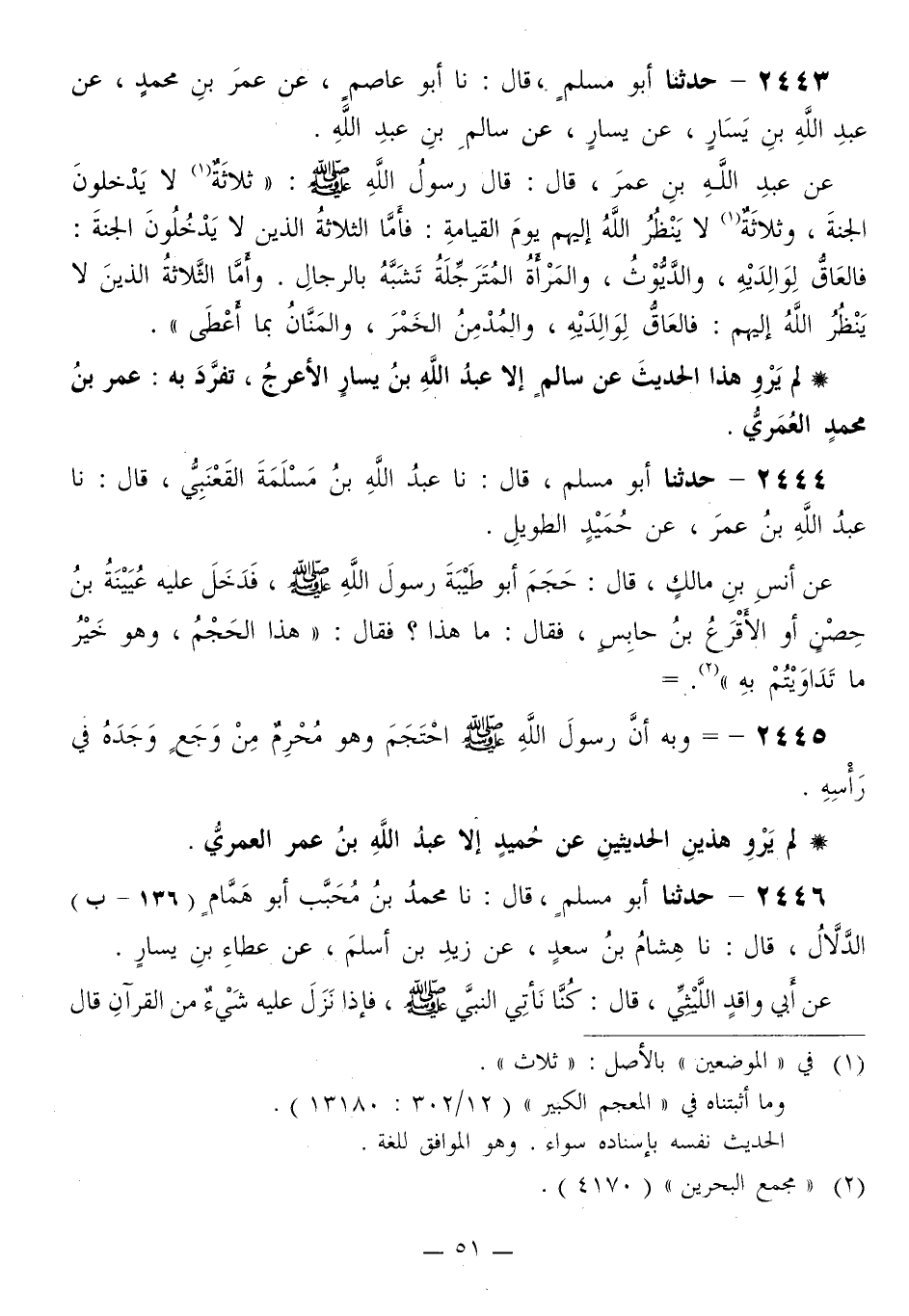 2443 - حَدَّثَنَا أَبُو مُسْلِمٍ قَالَ: نا أَبُو عَاصِمٍ، عَنْ عُمَرَ بْنِ مُحَمَّدٍ، عَنْ عَبْدِ اللَّهِ بْنِ يَسَارٍ، عَنْ يَسَارٍ، عَنْ سَالِمِ بْنِ عَبْدِ اللَّهِ، عَنْ عَبْدِ اللَّهِ بْنِ عُمَرَ قَالَ: قَالَ رَسُولُ اللَّهِ صَلَّى اللهُ عَلَيْهِ وَسَلَّمَ: «§ثَلَاثَةٌ لَا يَدْخُلُونَ الْجَنَّةَ، وَثَلَاثَةٌ لَا يَنْظُرُ اللَّهُ إِلَيْهِمْ يَوْمَ الْقِيَامَةِ: فَأَمَّا الثَّلَاثَةُ الَّذِينَ لَا يَدْخُلُونَ الْجَنَّةَ: فَالْعَاقُّ لِوَالِدَيْهِ، وَالدَّيُّوثُ، وَالْمَرْأَةُ الْمُتَرَجِّلَةُ تَشَبَّهُ بِالرِّجَالِ، وَأَمَّا الثَّلَاثَةُ الَّذِينَ لَا يَنْظُرُ اللَّهُ إِلَيْهِمْ: فَالْعَاقُّ لِوَالِدَيْهِ، وَالْمُدْمِنُ الْخَمْرَ، وَالْمَنَّانُ بِمَا أَعْطَى»