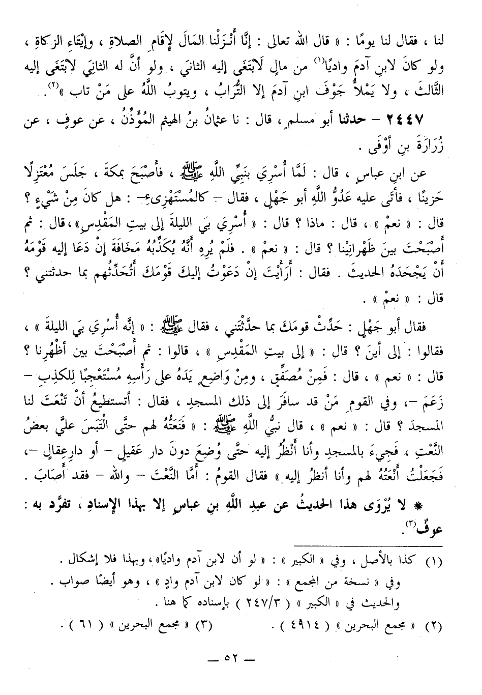 2447 - حَدَّثَنَا أَبُو مُسْلِمٍ قَالَ: نا عُثْمَانُ بْنُ الْهَيْثَمِ الْمُؤَذِّنُ، عَنْ عَوْفٍ، عَنْ زُرَارَةَ بْنِ أَوْفَى، عَنِ ابْنِ عَبَّاسٍ قَالَ: لَمَّا أُسْرِيَ بِنَبِيِّ اللَّهِ صَلَّى اللهُ عَلَيْهِ وَسَلَّمَ، فَأَصْبَحَ بِمَكَّةَ، جَلَسَ مُعْتَزِلًا حَزِينًا، فَأَتَى عَلَيْهِ عَدُوُّ اللَّهِ أَبُو جَهْلٍ، فَقَالَ كَالْمُسْتَهْزِئِ: هَلْ كَانَ مِنْ شَيْءٍ؟ قَالَ: «نَعَمْ» قَالَ: مَاذَا؟ قَالَ: «أُسْرِيَ بِيَ اللَّيْلَةَ إِلَى بَيْتِ الْمَقْدِسِ» قَالَ: ثُمَّ أَصْبَحْتَ بَيْنَ ظَهْرَانَيْنَا؟ قَالَ: «نَعَمْ» . فَلَمْ يُرِهِ أَنَّهُ يُكَذِّبُهُ مَخَافَةَ إِنْ دَعَا إِلَيْهِ قَوْمَهُ أَنْ يَجْحَدَهُ الْحَدِيثَ، فَقَالَ: أَرَأَيْتَ إِنْ دَعَوْتُ إِلَيْكَ قَوْمَكَ أَتُحَدِّثُهُمْ بِمَا حَدَّثْتَنِي؟ قَالَ: «نَعَمْ» فَقَالَ أَبُو جَهْلٍ: حَدِّثْ قَوْمَكَ بِمَا حَدَّثَتْنِي، فَقَالَ صَلَّى اللهُ عَلَيْهِ وَسَلَّمَ: «إِنَّهُ §أُسْرِيَ بِيَ اللَّيْلَةَ» ؟ فَقَالُوا: إِلَى أَيْنَ؟ قَالَ: «إِلَى بَيْتِ الْمَقْدِسِ» قَالُوا: ثُمَّ أَصْبَحْتَ بَيْنَ أَظْهُرِنَا؟ قَالَ: «نَعَمْ» قَالَ: فَمِنْ مُصَفِّقٍ، وَمِنْ وَاضِعٍ يَدَهُ عَلَى رَأْسِهِ مُسْتَعْجِبًا لِلْكَذِبِ، زَعَمَ، وَفِي الْقَوْمِ مَنْ قَدْ سَافَرَ إِلَى ذَلِكَ الْمَسْجِدِ، فَقَالَ: أَتَسْتَطِيعُ أَنْ تَنْعَتَ لَنَا الْمَسْجِدَ؟ قَالَ: «نَعَمْ» قَالَ نَبِيُّ اللَّهِ صَلَّى اللهُ عَلَيْهِ وَسَلَّمَ: «فَنَعَتُهُ لَهُمْ حَتَّى الْتَبَسَ عَلَيَّ بَعْضُ النَّعْتِ، فَجِيءَ بِالْمَسْجِدِ وَأَنَا أَنْظُرُ إِلَيْهِ حَتَّى وُضِعَ دُونَ دَارِ عَقِيلٍ، أَوْ دَارِ عِقَالٍ، فَجَعَلْتُ أَنْعَتُهُ لَهُمْ وَأَنَا أَنْظُرُ إِلَيْهِ» فَقَالَ الْقَوْمُ: أَمَّا النَّعْتُ، وَاللَّهِ، فَقَدْ أَصَابَ لَا يُرْوَى هَذَا الْحَدِيثُ عَنْ عَبْدِ اللَّهِ بْنِ عَبَّاسٍ إِلَّا بِهَذَا الْإِسْنَادِ، تَفَرَّدَ بِهِ عَوْفٌ