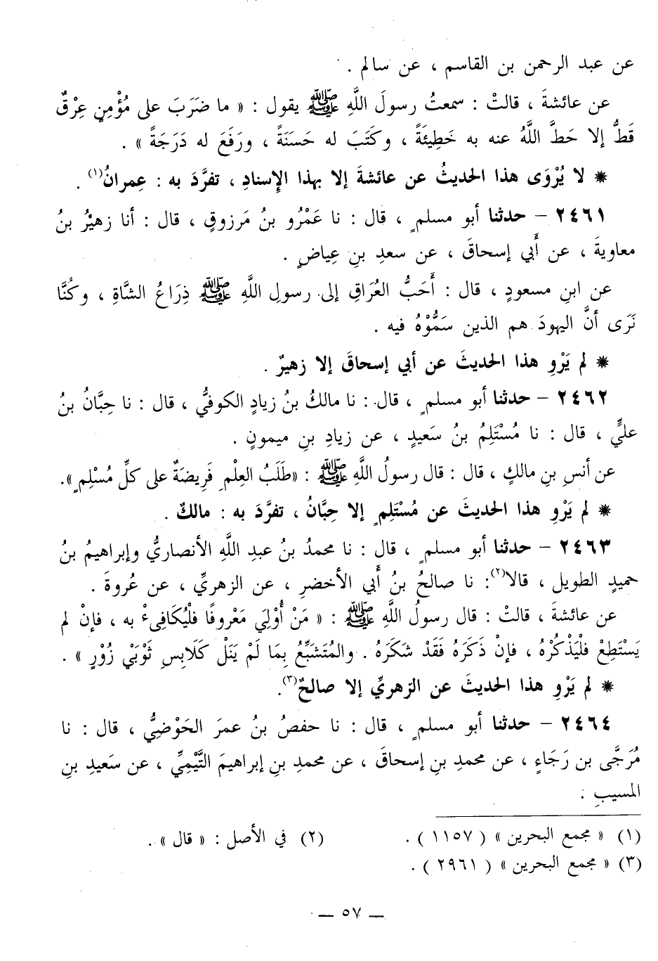 2462 - حَدَّثَنَا أَبُو مُسْلِمٍ قَالَ: نا مَالِكُ بْنُ زِيَادٍ الْكُوفِيُّ قَالَ: نا حِبَّانُ بْنُ عَلِيٍّ قَالَ: نا مُسْتَلِمُ بْنُ سَعِيدٍ، عَنْ زِيَادِ بْنِ مَيْمُونٍ، عَنْ أَنَسِ بْنِ مَالِكٍ قَالَ: قَالَ رَسُولُ اللَّهِ صَلَّى اللهُ عَلَيْهِ وَسَلَّمَ: «§طَلَبُ الْعِلْمِ فَرِيضَةٌ عَلَى كُلِّ مُسْلِمٍ»