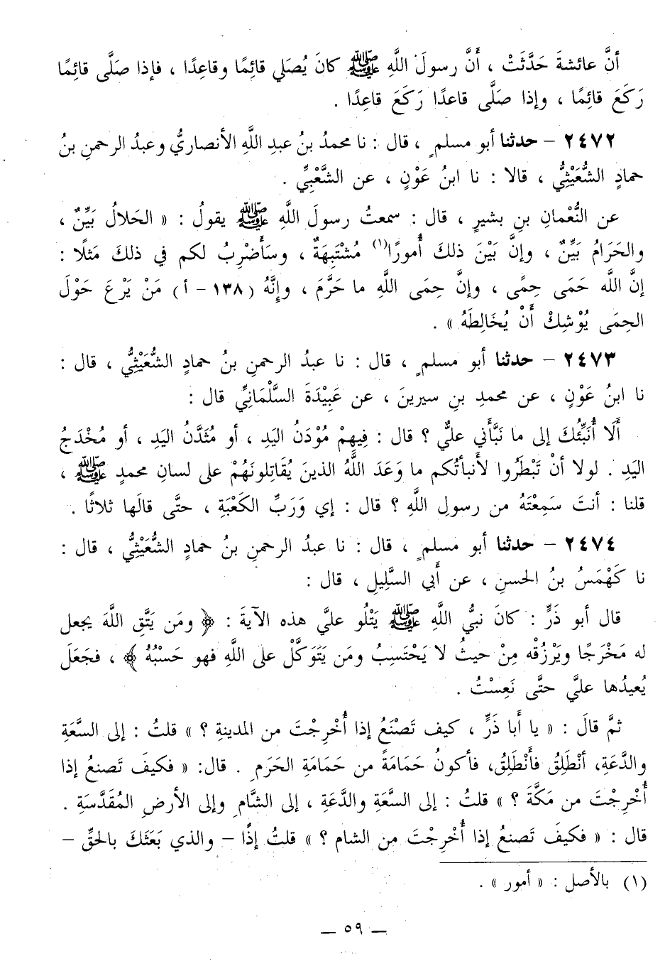2472 - حَدَّثَنَا أَبُو مُسْلِمٍ قَالَ: نا مُحَمَّدُ بْنُ عَبْدِ اللَّهِ الْأَنْصَارِيُّ، وَعَبْدُ الرَّحْمَنِ بْنُ حَمَّادٍ الشُّعَيْثِيُّ، قَالَا: نا ابْنُ عَوْنٍ، عَنِ الشَّعْبِيِّ، عَنِ النُّعْمَانِ بْنِ بَشِيرٍ قَالَ: سَمِعْتُ رَسُولَ اللَّهِ صَلَّى اللهُ عَلَيْهِ وَسَلَّمَ يَقُولُ: «§الْحَلَالُ بَيِّنٌ، وَالْحَرَامُ بَيِّنٌ، وَإِنَّ بَيْنَ ذَلِكَ أُمُورًا مُشْتَبِهَةً، وَسَأَضْرِبُ لَكُمْ فِي ذَلِكَ مَثَلًا: إِنَّ اللَّهَ حَمَى حِمًى، وإِنَّ حِمَى اللَّهِ مَا حَرَّمَ، وَإِنَّهُ مَنْ يَرْعَ حَوْلَ الْحِمَى يُوشِكُ أَنْ يُخَالِطَهُ»
