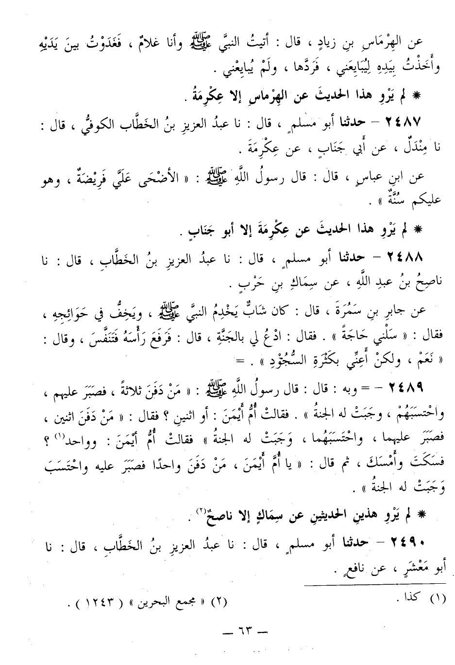2488 - حَدَّثَنَا أَبُو مُسْلِمٍ قَالَ: نا عَبْدُ الْعَزِيزِ بْنُ الْخَطَّابِ قَالَ: نا نَاصِحُ بْنُ عَبْدِ اللَّهِ، عَنْ سِمَاكِ بْنِ حَرْبٍ، عَنْ جَابِرِ بْنِ سَمُرَةَ قَالَ: كَانَ شَابٌّ يَخْدُمُ النَّبِيَّ صَلَّى اللهُ عَلَيْهِ وَسَلَّمَ، وَيَخِفُّ فِي حَوَائِجِهِ، فَقَالَ: «سَلْنِي حَاجَةً» . فَقَالَ: ادْعُ لِي بِالْجَنَّةِ قَالَ: فَرَفَعَ رَأْسَهُ فَتَنَفَّسَ، وَقَالَ: «§نَعَمْ، وَلَكِنْ أَعِنِّي بِكَثْرَةِ السُّجُودِ»
