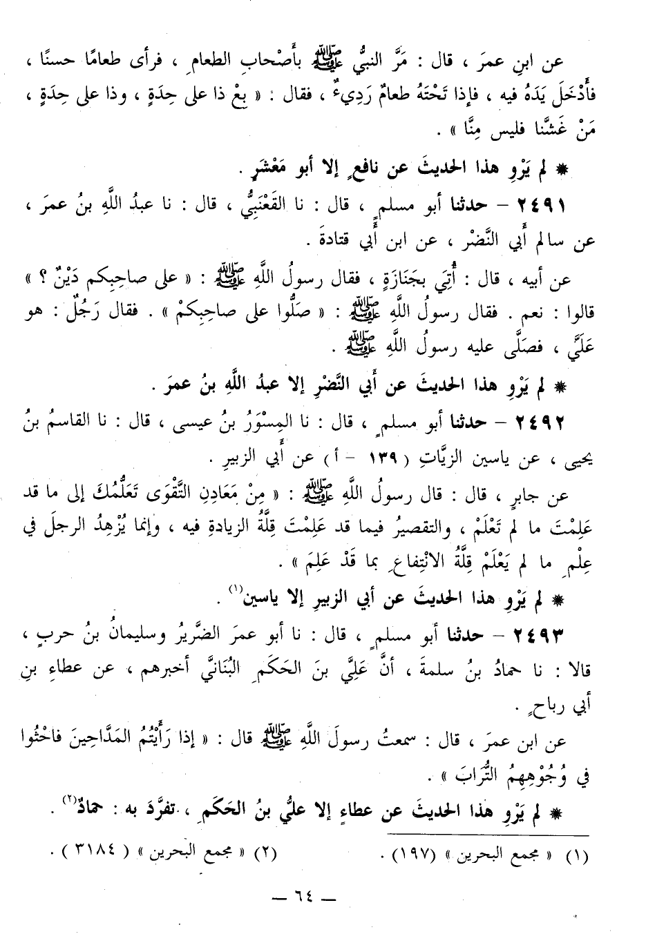 2493 - حَدَّثَنَا أَبُو مُسْلِمٍ قَالَ: نا أَبُو عُمَرَ الضَّرِيرُ، وَسُلَيْمَانُ بْنُ حَرْبٍ، قَالَا: نا حَمَّادُ بْنُ سَلَمَةَ، أَنَّ عَلِيَّ بْنَ الْحَكَمِ الْبُنَانِيَّ، أَخْبَرَهُمْ عَنْ عَطَاءِ بْنِ أَبِي رَبَاحَ، عَنِ ابْنِ عُمَرَ قَالَ: سَمِعْتُ رَسُولَ اللَّهِ صَلَّى اللهُ عَلَيْهِ وَسَلَّمَ قَالَ: «§إِذَا رَأَيْتُمُ الْمَدَّاحِينَ فَاحْثُوا فِي وُجُوهِهِمُ التُّرَابَ»