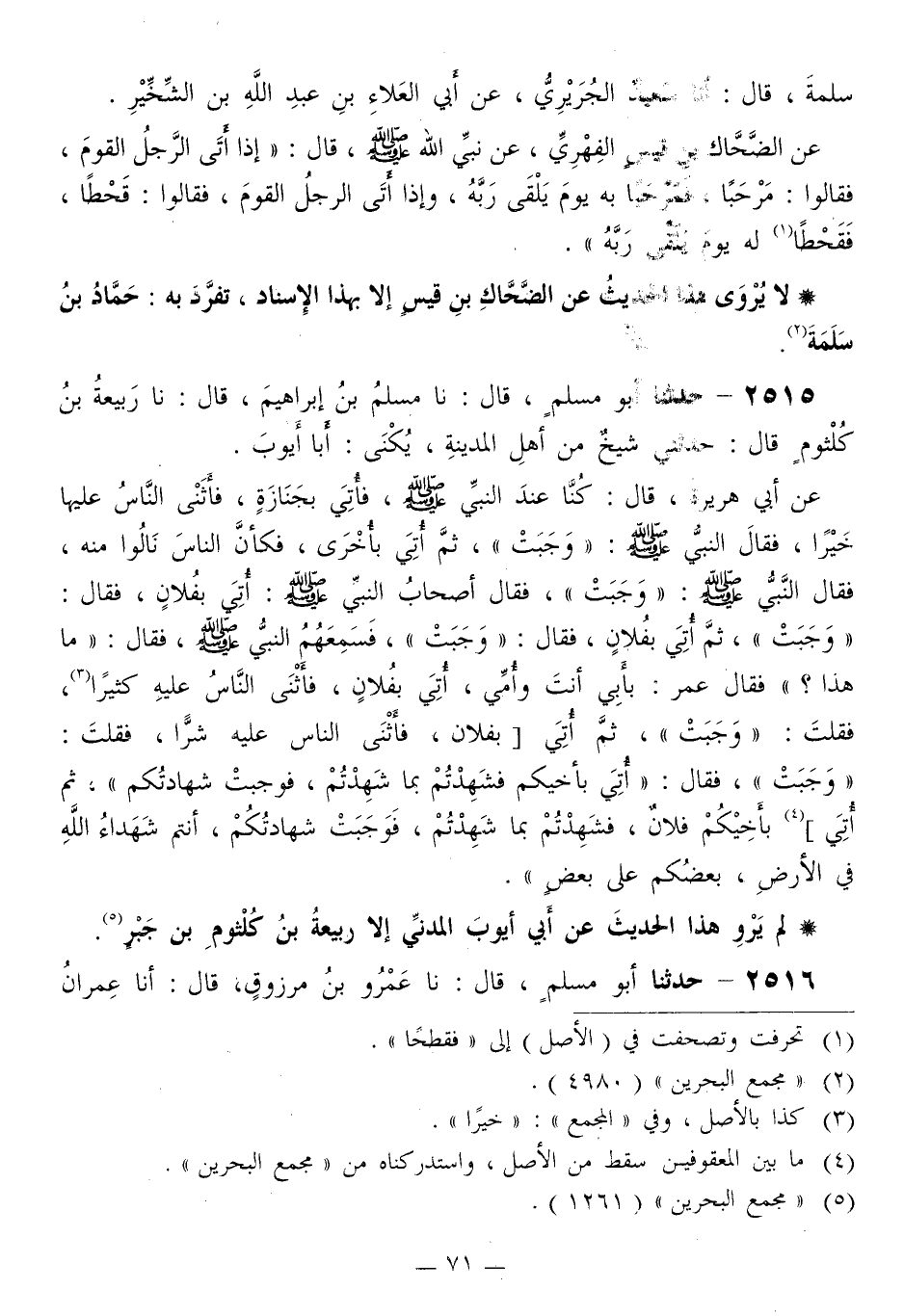2515 - حَدَّثَنَا أَبُو مُسْلِمٍ قَالَ: نا مُسْلِمُ بْنُ إِبْرَاهِيمَ قَالَ: نا رَبِيعَةُ بْنُ كُلْثُومٍ قَالَ: حَدَّثَنِي شَيْخٌ مِنْ أَهْلِ الْمَدِينَةِ يُكَنَّى أَبَا أَيُّوبَ، عَنْ أَبِي هُرَيْرَةَ قَالَ: كُنَّا عِنْدَ النَّبِيِّ صَلَّى اللهُ عَلَيْهِ وَسَلَّمَ، فَأُتِيَ بِجِنَازَةٍ، فَأَثْنَى النَّاسُ عَلَيْهَا خَيْرًا، فَقَالَ النَّبِيُّ صَلَّى اللهُ عَلَيْهِ وَسَلَّمَ: «وَجَبَتْ» ثُمَّ أُتِيَ بِأُخْرَى، فَكَأَنَّ النَّاسَ نَالُوا مِنْهُ، فَقَالَ النَّبِيُّ صَلَّى اللهُ عَلَيْهِ وَسَلَّمَ: «وَجَبَتْ» فَقَالَ أَصْحَابُ النَّبِيِّ صَلَّى اللهُ عَلَيْهِ وَسَلَّمَ: أُتِيَ بِفُلَانٍ، فَقَالَ: «وَجَبَتْ» ثُمَّ أُتِيَ بِفُلَانٍ، فَقَالَ: «وَجَبَتْ» فَسَمِعَهُمُ النَّبِيُّ صَلَّى اللهُ عَلَيْهِ وَسَلَّمَ، فَقَالَ: «مَا هَذَا؟» فَقَالَ عُمَرُ: بِأَبِي أَنْتَ وَأُمِّي، أُتِيَ بِفُلَانٍ، فَأَثْنَى النَّاسُ عَلَيْهِ كَثِيرًا، فَقُلْتَ: «وَجَبَتْ» ثُمَّ أُتِيَ بِفُلَانٍ، فَأَثْنَى النَّاسُ عَلَيْهِ شَرًّا، فَقُلْتَ: «وَجَبَتْ» فَقَالَ: «§أُتِيَ بِأَخِيكُمْ فَشَهِدْتُمْ بِمَا شَهِدْتُمْ، فَوَجَبَتْ شَهَادَتُكُمْ، ثُمَّ أُتِيَ بِأَخِيكُمْ فُلَانٍ، فَشَهِدْتُمْ بِمَا شَهِدْتُمْ، فَوَجَبَتْ شَهَادَتُكُمْ، أَنْتُمْ شُهَدَاءُ اللَّهِ فِي الْأَرْضِ، بَعْضُكُمْ عَلَى بَعْضٍ»
