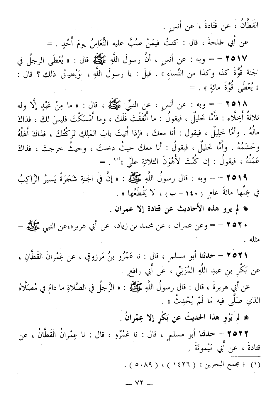 2520 - عَنْ قَتَادَةَ إِلَّا عِمْرَانُ وَعَنْ عِمْرَانَ، عَنْ مُحَمَّدِ بْنِ زِيَادٍ، عَنْ أَبِي هُرَيْرَةَ، عَنِ النَّبِيِّ صَلَّى اللهُ عَلَيْهِ وَسَلَّمَ مِثْلَهُ