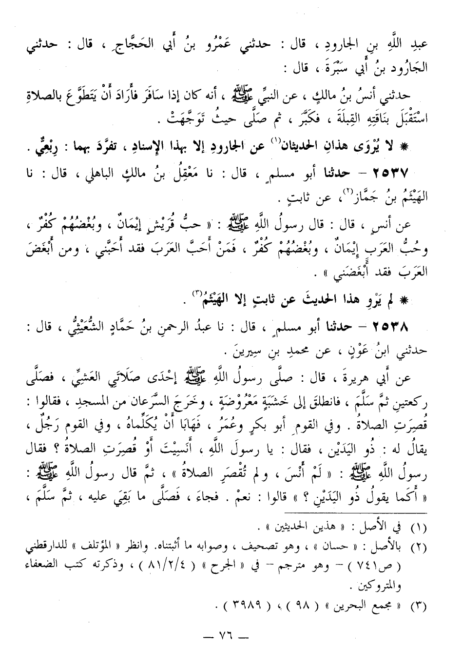 2537 - حَدَّثَنَا أَبُو مُسْلِمٍ قَالَ: نا مَعْقِلُ بْنُ مَالِكٍ الْبَاهلِيُّ قَالَ: نا الْهَيْثَمُ بْنُ جَمَّازٍ، عَنْ ثَابِتٍ، عَنْ أَنَسٍ قَالَ: قَالَ رَسُولُ اللَّهِ صَلَّى اللهُ عَلَيْهِ وَسَلَّمَ: «§حُبُّ قُرَيْشٍ إِيمَانٌ، وَبُغْضُهُمْ كُفْرٌ، وَحُبُّ الْعَرَبِ إِيمَانٌ، وَبُغْضُهُمْ كُفْرٌ، فَمَنْ أَحَبَّ الْعَرَبَ فَقَدْ أَحَبَّنِي، وَمَنْ أَبْغَضَ الْعَرَبَ فَقَدْ أَبْغَضَنِي»