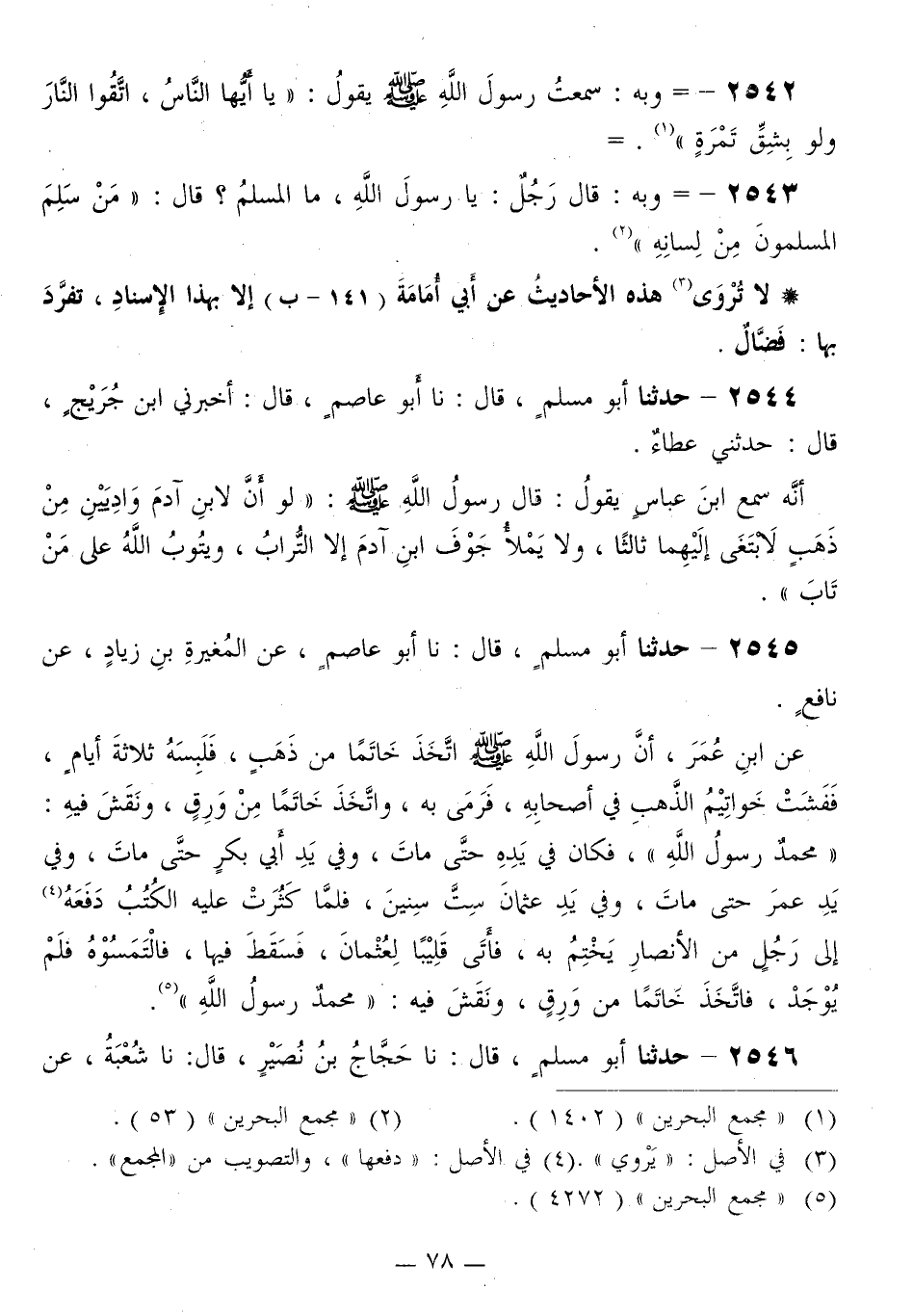 2545 - حَدَّثَنَا أَبُو مُسْلِمٍ قَالَ: نا أَبُو عَاصِمٍ، عَنِ الْمُغِيرَةِ بْنِ زِيَادٍ، عَنْ نَافِعٍ، عَنِ ابْنِ عُمَرَ «أَنَّ رَسُولَ اللَّهِ صَلَّى اللهُ عَلَيْهِ وَسَلَّمَ اتَّخَذَ خَاتَمًا مِنْ ذَهَبٍ، فَلَبِسَهُ ثَلَاثَةَ أَيَّامٍ، فَفَشَتْ خَوَاتِيمُ الذَّهَبِ فِي أَصْحَابِهِ، فَرَمَى بِهِ، §وَاتَّخَذَ خَاتَمًا مِنْ وَرِقٍ، وَنَقَشَ فِيهِ:» مُحَمَّدٌ رَسُولُ اللَّهِ «فَكَانَ فِي يَدِهِ حَتَّى مَاتَ» وَفِي يَدِ أَبِي بَكْرٍ، حَتَّى مَاتَ، وَفِي يَدِ عُمَرَ، حَتَّى مَاتَ، وَفِي يَدِ عُثْمَانَ سِتَّ سِنِينَ، فَلَمَّا كَثُرَتْ عَلَيْهِ الْكُتُبُ دَفَعَهُ إِلَى رَجُلٍ مِنَ الْأَنْصَارِ يَخْتِمُ بِهِ، فَأَتَى قَلِيبًا لِعُثْمَانَ، فَسَقَطَ فِيهَا، فَالْتَمَسُوهُ فَلَمْ يُوجَدْ، فَاتَّخَذَ خَاتَمًا مِنْ وَرِقٍ، وَنَقَشَ فِيهِ: «مُحَمَّدٌ رَسُولُ اللَّهِ»