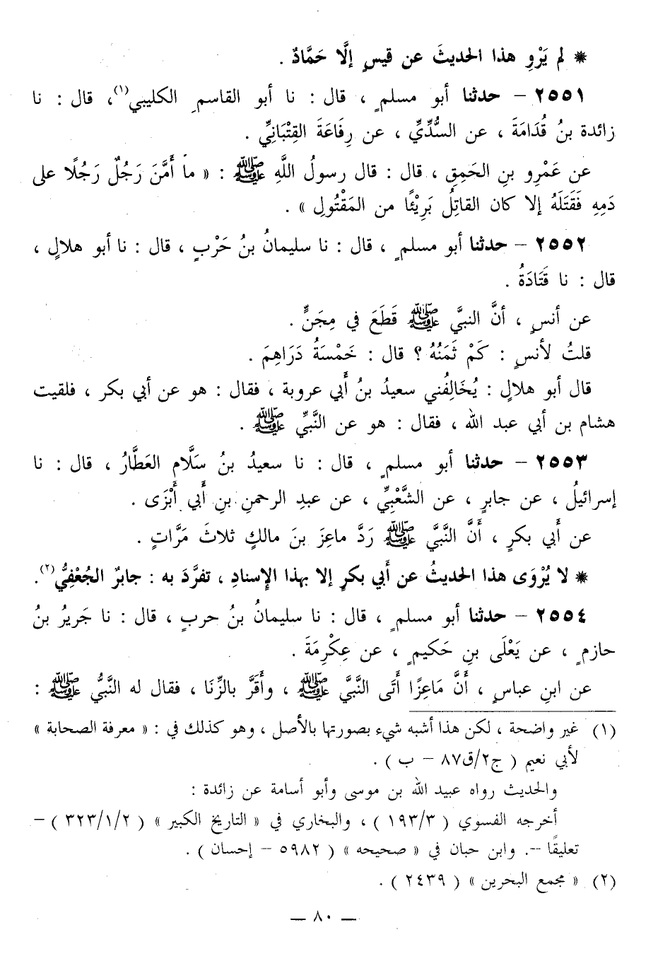 2553 - حَدَّثَنَا أَبُو مُسْلِمٍ قَالَ: نا سَعِيدُ بْنُ سَلَّامٍ الْعَطَّارُ قَالَ: نا إِسْرَائِيلُ، عَنْ جَابِرٍ، عَنِ الشَّعْبِيِّ، عَنْ عَبْدِ الرَّحْمَنِ بْنِ أَبِي أَبْزَى، عَنْ أَبِي بَكْرٍ أَنَّ النَّبِيَّ صَلَّى اللهُ عَلَيْهِ وَسَلَّمَ §رَدَّ مَاعِزَ بْنَ مَالِكٍ ثَلَاثَ مَرَّاتٍ لَا يُرْوَى هَذَا الْحَدِيثُ عَنْ أَبِي بَكْرٍ إِلَّا بِهَذَا الْإِسْنَادِ، تَفَرَّدَ بِهِ جَابِرٌ الْجُعْفِيُّ