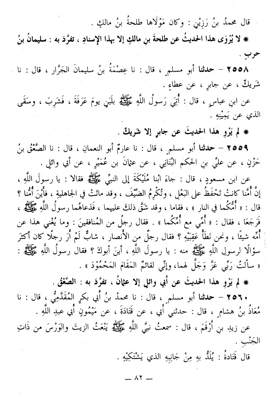 2559 - حَدَّثَنَا أَبُو مُسْلِمٍ قَالَ: نا عَارِمٌ أَبُو النُّعْمَانِ قَالَ: نا الصَّعْقُ بْنُ حَزْنِ، عَنْ عَلِيِّ بْنِ الْحَكَمِ الْبُنَانِيِّ، عَنْ عُثْمَانَ بْنِ عُمَيْرٍ، عَنْ أَبِي وَائِلٍ، عَنِ ابْنِ مَسْعُودٍ قَالَ: جَاءَ ابْنًا مُلَيْكَةَ إِلَى النَّبِيِّ صَلَّى اللهُ عَلَيْهِ وَسَلَّمَ فَقَالَا: يَا رَسُولَ اللَّهِ، إِنَّ أُمَّنَا كَانَتْ تَحْفَظُ عَلَى الْبَعْلِ، وَتُكْرِمُ الضَّيْفَ، وَقَدْ مَاتَتْ فِي الْجَاهِلِيَّةِ، فَأَيْنَ أُمُّنَا؟ قَالَ: «§أُمُّكُمَا فِي النَّارِ» ، فَقَامَا، وَقَدْ شَقَّ ذَلِكَ عَلَيْهِمَا، فَدَعَاهُمَا رَسُولُ اللَّهِ صَلَّى اللهُ عَلَيْهِ وَسَلَّمَ، فَرَجَعَا، فَقَالَ: «أُمِّي مَعَ أُمِّكُمَا» فَقَالَ رَجُلٌ مِنَ الْمُنَافِقِينَ: وَمَا يُغْنِي هَذَا عَنْ أُمِّهِ شَيْئًا، وَنَحْنُ نَطَأُ عَقِبَيْهِ؟ فَقَالَ رَجُلٌ مِنَ الْأَنْصَارِ، شَابٌّ لَمْ أَرَ رَجُلًا كَانَ أَكْثَرَ سُؤَالًا لِرَسُولِ اللَّهِ صَلَّى اللهُ عَلَيْهِ وَسَلَّمَ مِنْهُ: يَا رَسُولَ اللَّهِ، أَيْنَ أَبُوكَ؟ فَقَالَ رَسُولُ اللَّهِ صَلَّى اللهُ عَلَيْهِ وَسَلَّمَ: «سَأَلْتُ رَبِّي عَزَّ وَجَلَّ لَهُمَا، وَإِنِّي لَقَائِمٌ الْمَقَامَ الْمَحْمُودَ»