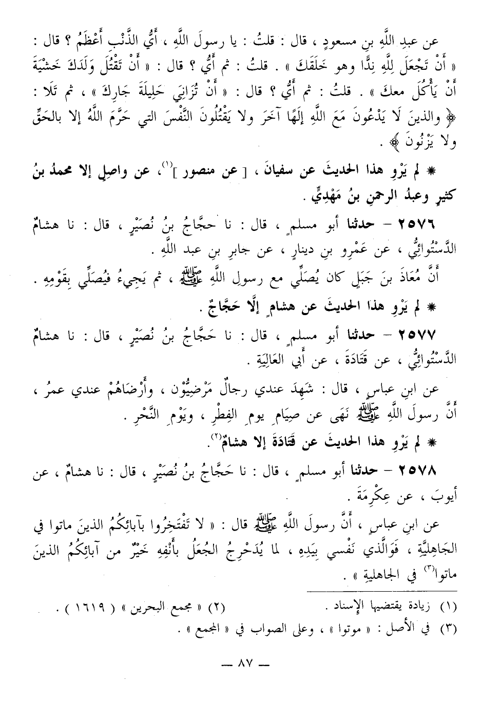 2576 - حَدَّثَنَا أَبُو مُسْلِمٍ قَالَ: نا حَجَّاجُ بْنُ نُصَيْرٍ قَالَ: نا هِشَامٌ الدَّسْتُوَائِيُّ، عَنْ عَمْرِو بْنِ دِينَارٍ، عَنْ جَابِرِ بْنِ عَبْدِ اللَّهِ، أَنَّ مُعَاذَ بْنَ جَبَلٍ، كَانَ §يُصَلِّي مَعَ رَسُولِ اللَّهِ صَلَّى اللهُ عَلَيْهِ وَسَلَّمَ، ثُمَّ يَجِيءُ فَيُصَلِّي بِقَوْمِهِ لَمْ يَرْوِ هَذَا الْحَدِيثَ عَنْ هِشَامٍ إِلَّا حَجَّاجٌ
