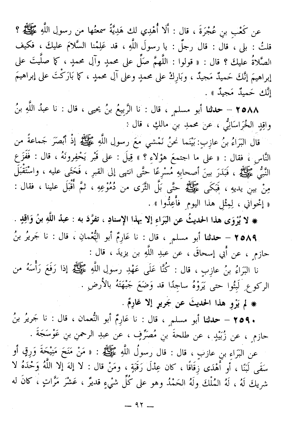 2590 - حَدَّثَنَا أَبُو مُسْلِمٍ قَالَ: نا عَارِمٌ أَبُو النُّعْمَانِ قَالَ: نا جَرِيرُ بْنُ حَازِمٍ، عَنْ زُبَيْدٍ، عَنْ طَلْحَةَ بْنِ مُصَرِّفٍ، عَنْ عَبْدِ الرَّحْمَنِ بْنِ عَوْسَجَةَ، عَنِ الْبَرَاءِ بْنِ عَازِبٍ قَالَ: قَالَ رَسُولُ اللَّهِ صَلَّى اللهُ عَلَيْهِ وَسَلَّمَ: «§مَنْ مَنَحَ مَنِيحَةَ وَرِقٍ أَوْ سَقَى لَبَنًا، أَوْ أَهْدَى زِقَاقًا، كَانَ عِدْلَ رَقَبَةٍ، وَمَنْ قَالَ: لَا إِلَهَ إِلَّا اللَّهُ وَحْدَهُ لَا شَرِيكَ لَهُ، لَهُ الْمُلْكُ، وَلَهُ الْحَمْدُ وَهُوَ عَلَى كُلِّ شَيْءٍ قَدِيرٌ، عَشْرَ مَرَّاتٍ، كَانَ لَهُ -[93]- عِدْلُ رَقَبَةٍ»