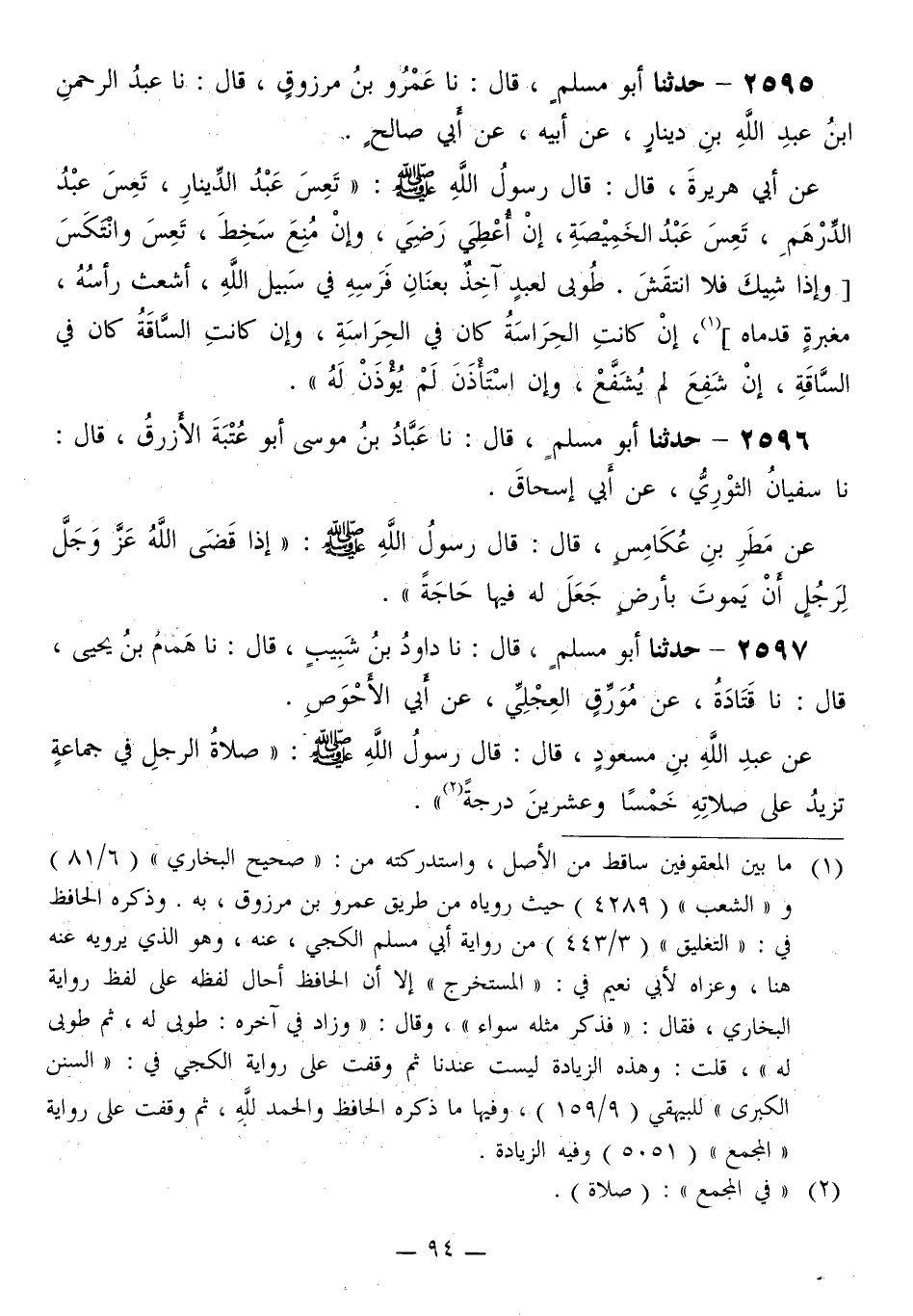 2595 - حَدَّثَنَا أَبُو مُسْلِمٍ قَالَ: نا عَمْرُو بْنُ مَرْزُوقٍ قَالَ: نا عَبْدُ الرَّحْمَنِ بْنُ عَبْدِ اللَّهِ بْنِ دِينَارٍ، عَنْ أَبِيهِ، عَنْ أَبِي صَالِحٍ، عَنْ أَبِي هُرَيْرَةَ قَالَ: قَالَ رَسُولُ اللَّهِ صَلَّى اللهُ عَلَيْهِ وَسَلَّمَ: «§تَعِسَ عَبْدُ الدِّينَارِ، تَعِسَ عَبْدُ الدِّرْهَمِ، تَعِسَ عَبْدُ الْخَمِيصَةِ، إِنْ أُعْطِيَ رَضِيَ، وَإِنْ مُنِعَ سَخِطَ، تَعِسَ وَانْتَكَسَ، وَإِذَا شِيكَ فَلَا انْتَقَشَ، طُوبَى لِعَبْدٍ آخِذٍ بِعِنَانِ فَرَسِهِ فِي سَبِيلِ اللَّهِ، أَشْعَثُ رَأْسُهُ، مُغْبَرَّةٌ قَدَمَاهُ، وَإِنْ كَانَتِ الْحِرَاسَةُ كَانَ فِي الْحِرَاسَةِ، وَإِنْ كَانَتِ السَّاقَةُ كَانَ فِي السَّاقَةِ، إِنْ شَفَعَ لَمْ يُشَفَّعْ، وإِنِ اسْتَأَذَنَ لَمْ يُؤْذَنْ لَهُ»