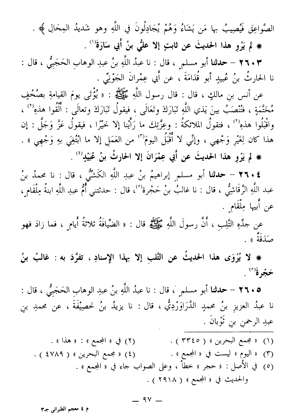 2603 - حَدَّثَنَا أَبُو مُسْلِمٍ قَالَ: نا عَبْدُ اللَّهِ بْنُ عَبْدِ الْوَهَّابِ الْحَجَبِيُّ قَالَ: نا الْحَارِثُ بْنُ عُبَيْدٍ أَبُو قُدَامَةَ، عَنْ أَبِي عِمْرَانَ الْجَوْنِيِّ، عَنْ أَنَسِ بْنِ مَالِكٍ قَالَ: قَالَ رَسُولُ اللَّهِ صَلَّى اللهُ عَلَيْهِ وَسَلَّمَ: «يُؤْتَى يَوْمَ الْقِيَامَةِ بُصُحُفٍ مُخَتَّمَةٍ، فَتُنَصَبُ بَيْنَ يَدَيِ اللَّهِ تَبَارَكَ وَتَعَالَى، فَيَقُولُ تَبَارَكَ وَتَعَالَى: §أَلْقُوا هَذِهِ، واقْبَلُوا هَذِهِ، فَتَقُولُ الْمَلَائِكَةُ: وَعِزَّتِكَ مَا رَأَيْنَا إِلَّا خَيْرًا، فَيَقُولُ عَزَّ وَجَلَّ: إِنَّ هَذَا كَانَ لِغَيْرِ وَجْهِي، وَإِنِّي لَا أَقْبَلُ الْيَوْمَ مِنَ الْعَمَلِ إِلَّا مَا ابْتُغِيَ بِهِ وَجْهِي»