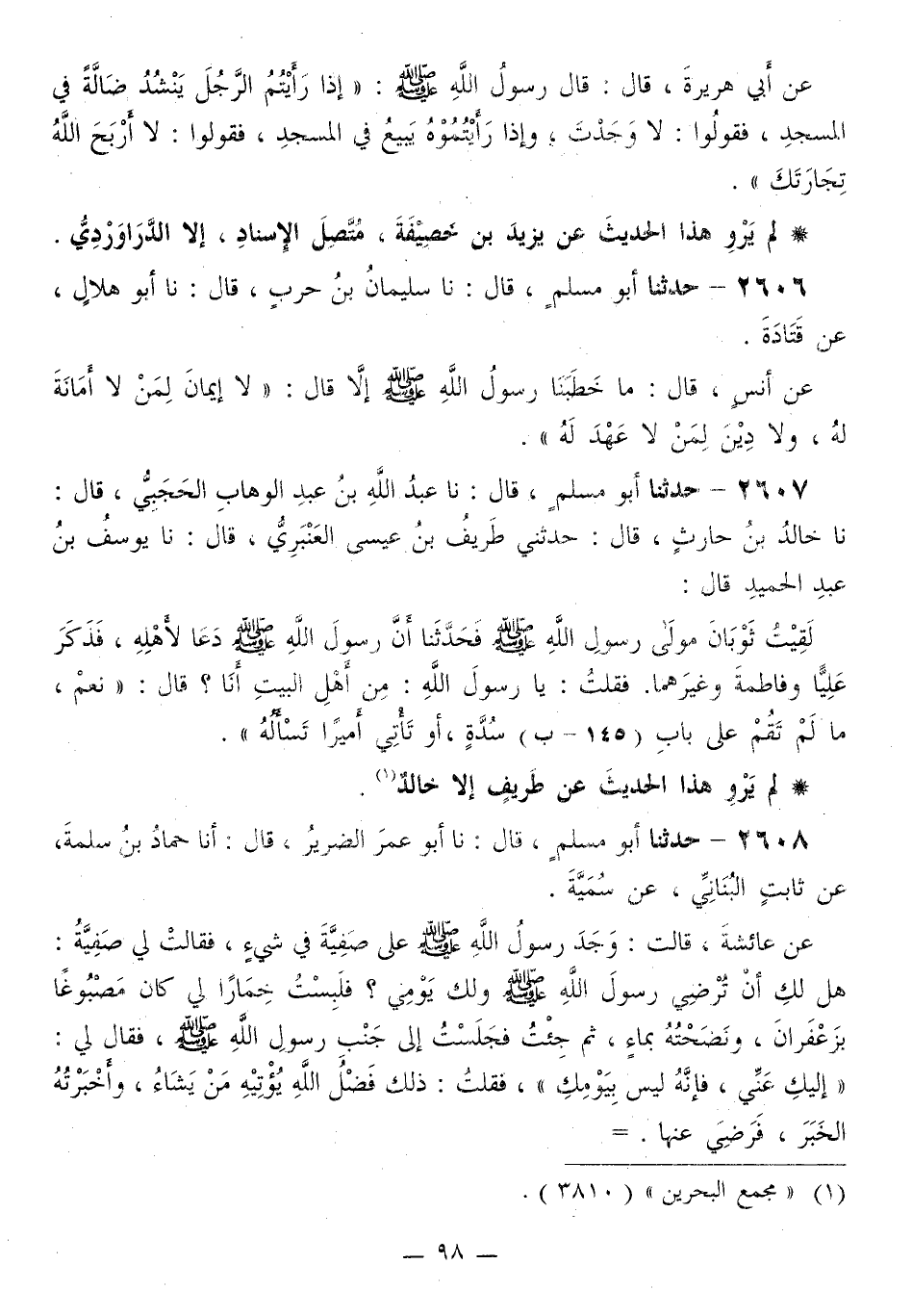 2607 - حَدَّثَنَا أَبُو مُسْلِمٍ قَالَ: نا عَبْدُ اللَّهِ بْنُ عَبْدِ الْوَهَّابِ الْحَجَبِيُّ قَالَ: نا خَالِدُ بْنُ حَارِثٍ قَالَ: حَدَّثَنِي طَرِيفُ بْنُ عِيسَى الْعَنْبَرِيُّ قَالَ: نا يُوسُفُ بْنُ عَبْدِ الْحَمِيدِ قَالَ: لَقِيتُ ثَوْبَانَ، مَوْلَى رَسُولِ اللَّهِ صَلَّى اللهُ عَلَيْهِ وَسَلَّمَ فَحَدَّثَنَا أَنَّ رَسُولَ اللَّهِ صَلَّى اللهُ عَلَيْهِ وَسَلَّمَ دَعَا لِأَهْلِهِ، فَذَكَرَ عَلِيًّا وَفَاطِمَةَ وَغَيْرَهُمَا. فَقُلْتُ: يَا رَسُولَ اللَّهِ: §مِنْ أَهْلِ الْبَيْتِ أَنَا؟ قَالَ: «نَعَمْ، مَا لَمْ تَقُمْ عَلَى بَابِ سُدَّةٍ، أَوْ تَأْتِي أَمِيرًا تَسْأَلُهُ»