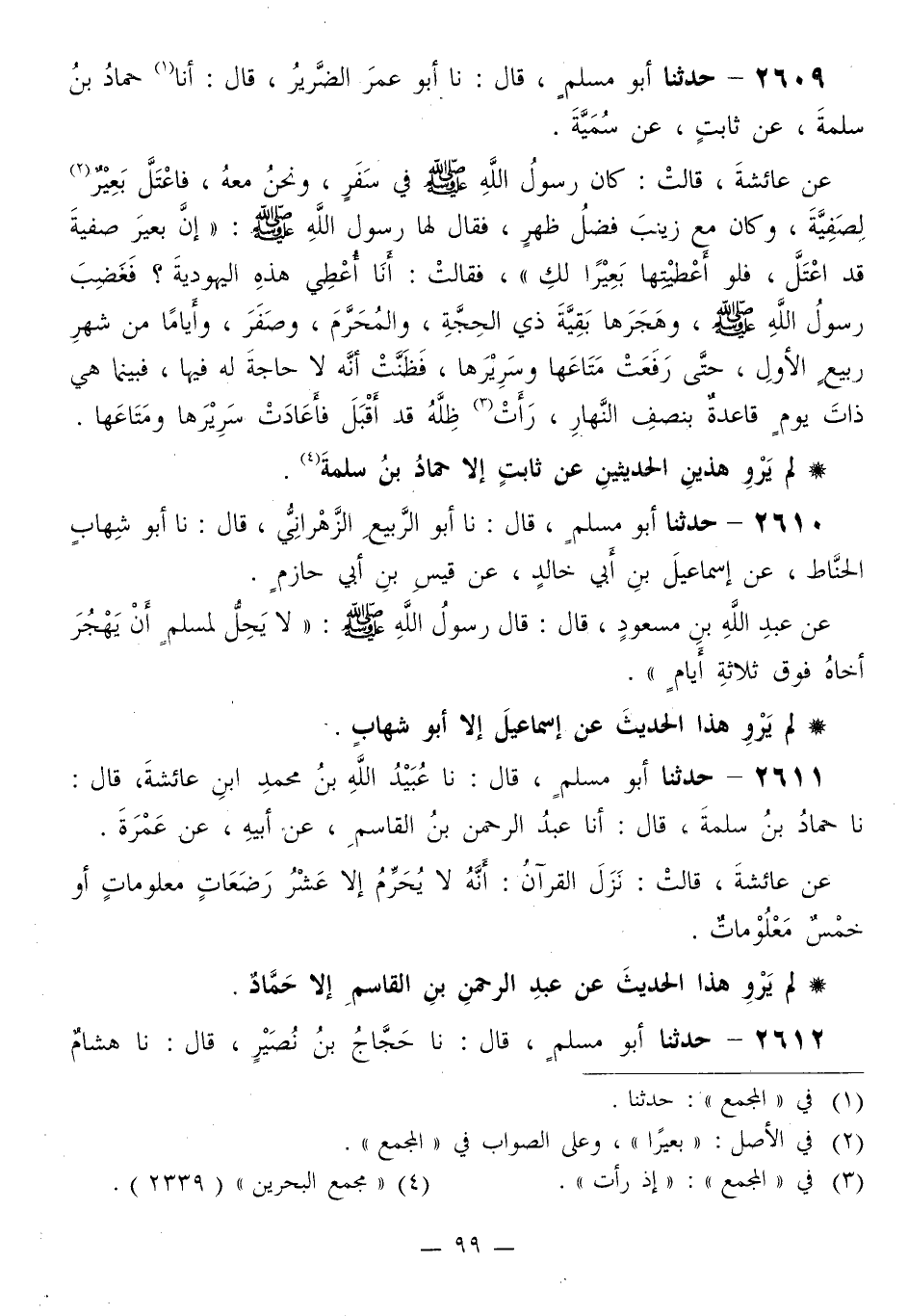 2609 - حَدَّثَنَا أَبُو مُسْلِمٍ قَالَ: نا أَبُو عُمَرَ الضَّرِيرُ قَالَ: أَنَا حَمَّادُ بْنُ سَلَمَةَ، عَنْ ثَابِتٍ، عَنْ سُمَيَّةَ، عَنْ عَائِشَةَ قَالَتْ: كَانَ رَسُولُ اللَّهِ صَلَّى اللهُ عَلَيْهِ وَسَلَّمَ فِي سَفَرٍ وَنَحْنُ مَعَهُ، فَاعْتَلَّ بَعِيرٌ لِصَفِيَّةَ، وَكَانَ مَعَ زَيْنَبَ فَضْلُ ظَهْرٍ، فَقَالَ لَهَا رَسُولُ اللَّهِ صَلَّى اللهُ عَلَيْهِ وَسَلَّمَ: «إِنَّ §بَعِيرَ صَفِيَّةَ قَدِ اعْتَلَّ، فَلَوْ أَعْطَيْتِهَا بَعِيرًا لَكِ» ، فَقَالَتْ: أَنَا أُعْطِي هَذِهِ الْيَهُودِيَّةَ؟ فَغَضِبَ رَسُولُ اللَّهِ صَلَّى اللهُ عَلَيْهِ وَسَلَّمَ، وهَجَرَهَا بَقِيَّةَ ذِي الْحِجَّةِ وَالْمُحَرَّمَ وَصَفَرَ، وأَيَّامًا مِنْ شَهْرِ رَبِيعٍ الْأَوَّلِ، حَتَّى رَفَعَتْ مَتَاعَهَا وَسَرِيرَهَا، فَظَنَّتْ أَنَّهُ لَا حَاجَةَ لَهُ فِيهَا، فَبَيْنَمَا هِيَ ذَاتَ يَوْمٍ قَاعِدَةٌ بِنِصْفِ النَّهَارِ، رَأَتْ ظِلَّهُ قَدْ أَقْبَلَ فَأَعَادَتْ سَرِيرَهَا وَمَتَاعَهَا لَمْ يَرْوِ هَذَيْنِ الْحَدِيثَيْنِ عَنْ ثَابِتٍ إِلَّا حَمَّادُ بْنُ سَلَمَةَ