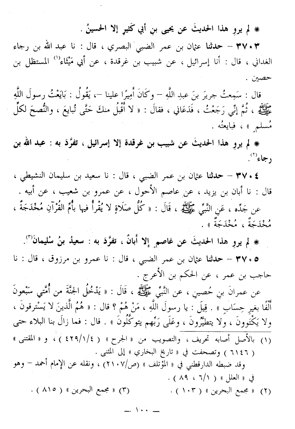 3705 - حَدَّثَنَا عُثْمَانُ بْنُ عُمَرَ الضَّبِّيُّ قَالَ: نا عَمْرُو بْنُ مَرْزُوقٍ قَالَ: نا حَاجِبُ بْنُ عُمَرَ، عَنِ الْحَكَمِ بْنِ الْأَعْرَجِ، عَنْ عِمْرَانَ بْنِ حُصَيْنٍ، عَنِ النَّبِيِّ صَلَّى اللهُ عَلَيْهِ وَسَلَّمَ قَالَ: «§يَدْخُلُ الْجَنَّةَ مِنْ أُمَّتِي سَبْعُونَ أَلْفًا بِغَيْرِ حِسَابٍ» قِيلَ: يَا رَسُولَ اللَّهِ، مَنْ هُمْ؟ قَالَ: «هُمُ الَّذِينَ لَا يَسْتَرَقُونَ، وَلَا يَكْتَوُونَ وَلَا يَتَطَيَّرُونَ، وَعَلَى رَبِّهِمْ يَتَوَكَّلُونَ» قَالَ: «فَمَا زَالَ بِنَا الْبَلَاءُ حَتَّى -[101]- اكْتَوَيْنَا فَمَا أَفْلَحْنَا وَلَا أَنْجَحْنَا»