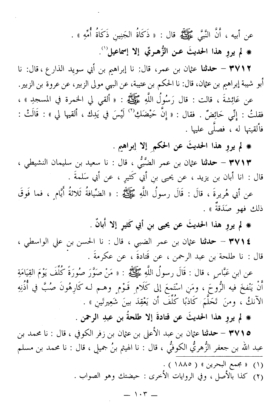 حَدَّثَنَا عُثْمَانُ بْنُ عُمَرَ الضَّبِّيُّ قَالَ: نا الْحَسَنُ بْنُ عَلِيٍّ الْوَاسِطِيُّ قَالَ: نا طَلْحَةُ بْنُ عَبْدِ الرَّحْمَنِ، عَنْ قَتَادَةَ، عَنْ عِكْرِمَةَ، عَنِ ابْنِ عَبَّاسٍ قَالَ: قَالَ رَسُولُ اللَّهِ صَلَّى اللهُ عَلَيْهِ وَسَلَّمَ: «§مَنْ صَوَّرَ صُورَةً كُلِّفَ يَوْمَ الْقِيَامَةِ أَنْ يَنْفُخَ فِيهِ الرُّوحَ» وَمَنِ اسْتَمَعَ إِلَى كَلَامِ قَوْمٍ وَهُمْ لَهُ كَارِهُونَ صُبَّ فِي أُذُنِهِ الْآنُكُ «وَمَنْ تَحَلَّمَ كَاذِبًا كُلِّفَ أَنْ يَعْقِدَ بَيْنَ شَعِيرَتَيْنِ»