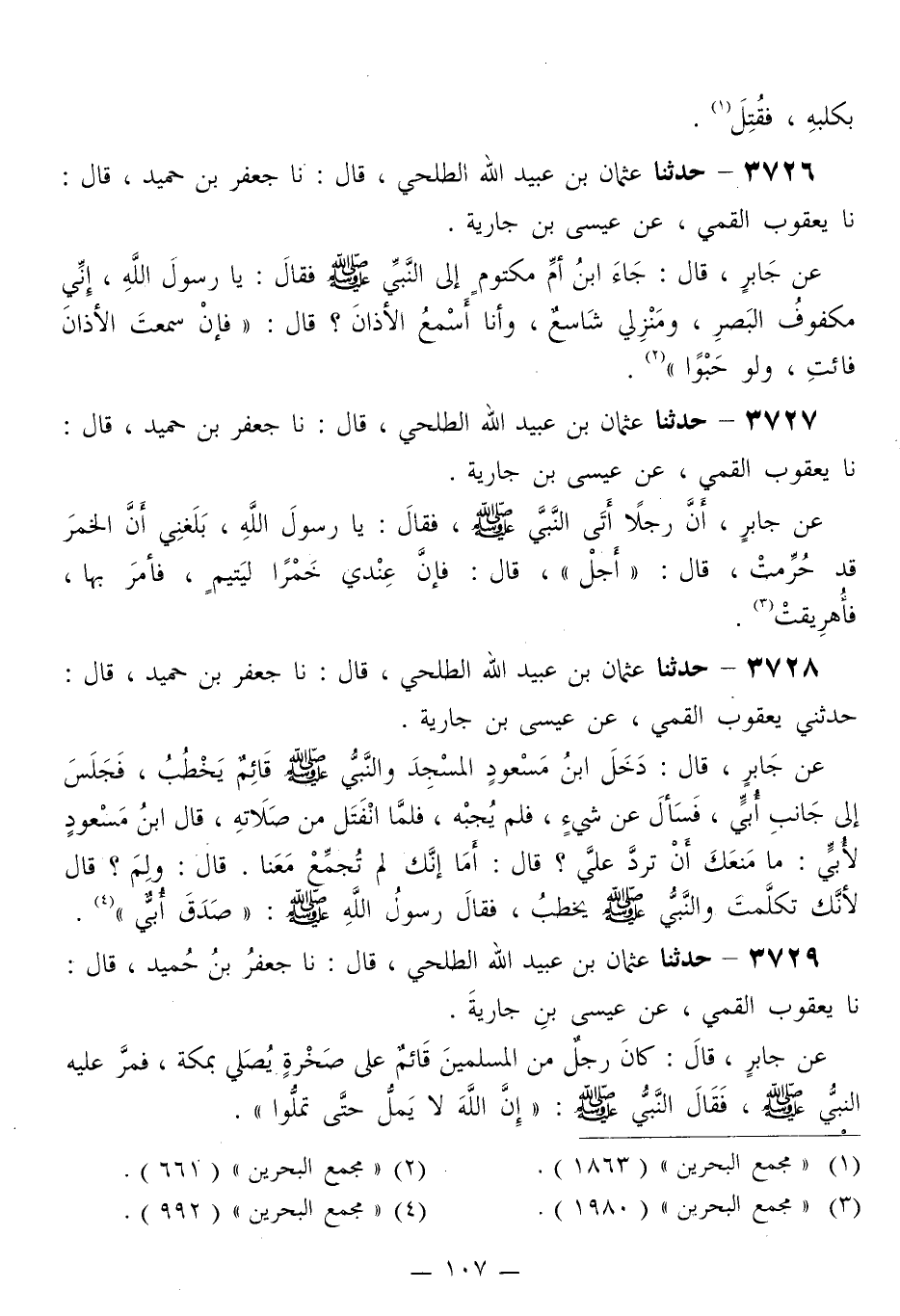 3728 - حَدَّثَنَا عُثْمَانُ بْنُ عُبَيْدِ اللَّهِ الطَّلْحِيُّ قَالَ: نا جَعْفَرُ بْنُ حُمَيْدٍ قَالَ: حَدَّثَنِي يَعْقُوبُ الْقُمِّيُّ، عَنْ عِيسَى بْنِ جَارِيَةَ، عَنْ جَابِرٍ قَالَ: دَخَلَ ابْنُ مَسْعُودٍ الْمَسْجِدَ وَالنَّبِيُّ صَلَّى اللهُ عَلَيْهِ وَسَلَّمَ قَائِمٌ يَخْطُبُ، فَجَلَسَ إِلَى جَانِبِ أُبَيٍّ، فَسَأَلَ عَنْ شَيْءٍ، فَلَمْ يُجِبْهُ، فَلَمَّا انْفَتَلَ مِنْ صَلَاتِهِ، قَالَ ابْنُ مَسْعُودٍ لِأُبَيٍّ: مَا مَنَعَكَ أَنْ تَرُدِّ عَلَيَّ؟ قَالَ: أَمَا §إِنَّكَ لَمْ تُجَمِّعْ مَعَنَا قَالَ: وَلِمَ؟ قَالَ: لِأَنَّكَ تَكَلَّمْتَ وَالنَّبِيُّ صَلَّى اللهُ عَلَيْهِ وَسَلَّمَ يَخْطُبُ، فَقَالَ رَسُولُ اللَّهِ صَلَّى اللهُ عَلَيْهِ وَسَلَّمَ: «صَدَقَ أُبَيٌّ»