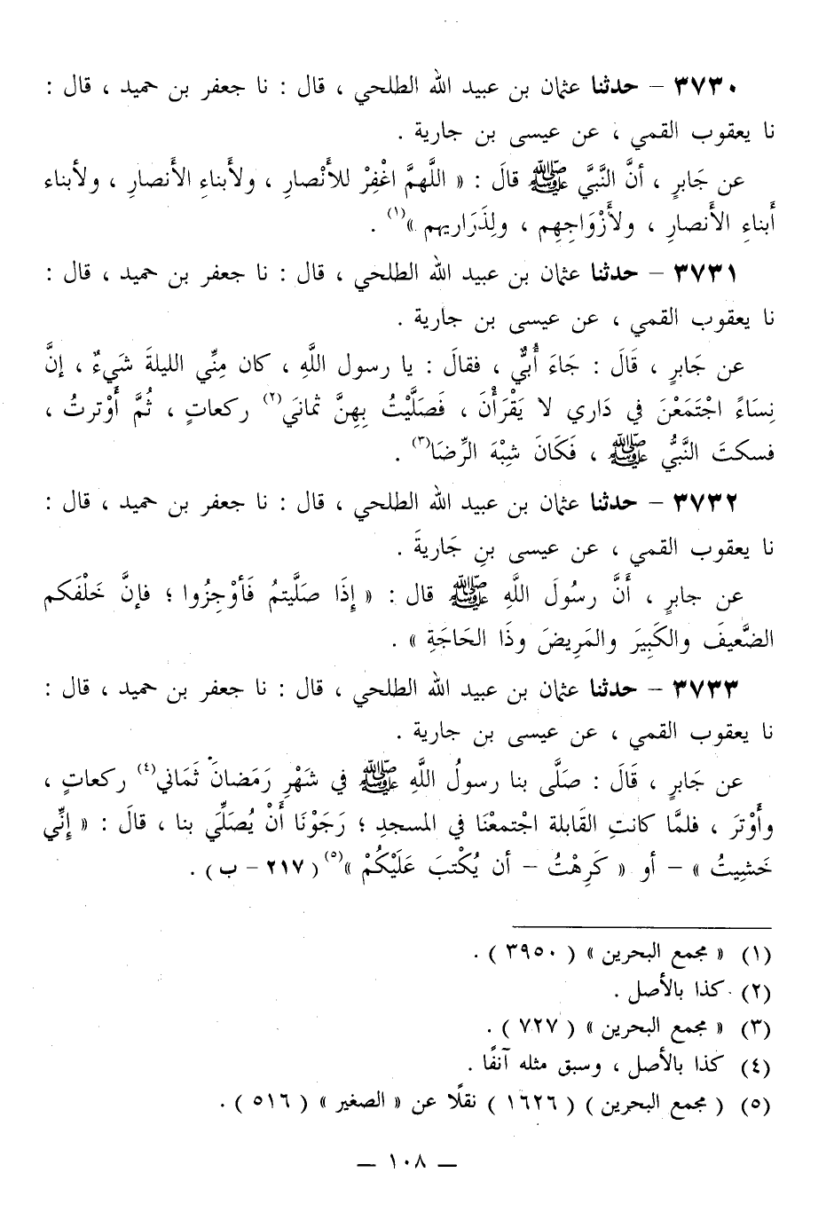 3731 - حَدَّثَنَا عُثْمَانُ بْنُ عُبَيْدِ اللَّهِ الطَّلْحِيُّ قَالَ: نا جَعْفَرُ بْنُ حُمَيْدٍ قَالَ: نا يَعْقُوبُ الْقُمِّيُّ، عَنْ عِيسَى بْنِ جَارِيَةَ، عَنْ جَابِرٍ قَالَ: جَاءَ أُبَيُّ فَقَالَ: «يَا رَسُولَ اللَّهِ، كَانَ مِنِّي اللَّيْلَةَ شَيْءٌ إِنَّ §نِسَاءً اجْتَمَعْنَ فِي دَارِي لَا يَقْرَأْنَ، فَصَلَّيْتُ بِهِنَّ ثَمَانِيَ رَكَعَاتٍ، ثُمَّ أَوْتَرْتُ فَسَكَتَ النَّبِيُّ صَلَّى اللهُ عَلَيْهِ وَسَلَّمَ، فَكَانَ شِبْهَ الرِّضَا»