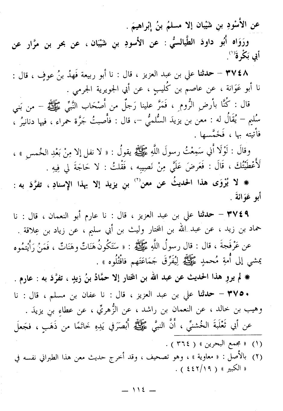 3748 - حَدَّثَنَا عَلِيُّ بْنُ عَبْدِ الْعَزِيزِ قَالَ: نا أَبُو رَبِيعَةَ فَهْدُ بْنُ عَوْفٍ قَالَ: نا أَبُو عَوَانَةَ، عَنْ عَاصِمِ بْنِ كُلَيْبٍ، عَنْ أَبِي الْجُوَيْرِيَةِ الْجَرْمِيِّ قَالَ: كُنَّا بِأَرْضِ الرُّومِ، فَمَرَّ عَلَيْنَا رَجُلٌ مِنْ أَصْحَابِ النَّبِيِّ صَلَّى اللهُ عَلَيْهِ وَسَلَّمَ مِنْ بَنِي سُلَيْمٍ يُقَالُ لَهُ: مَعْنُ بْنُ يَزِيدَ السُّلَمِيُّ قَالَ: فَأَصَبْتُ جَرَّةً حَمْرَاءَ فِيهَا دَنَانِيرُ فَأَتَيْتُهُ بِهَا، فَخَمَّسَهَا وَقَالَ: لَوْلَا أَنِّي سَمِعْتُ رَسُولَ اللَّهِ صَلَّى اللهُ عَلَيْهِ وَسَلَّمَ يَقُولُ: «§لَا نَفْلَ إِلَّا مِنْ بَعْدِ الْخُمُسِ» لَأَعْطَيْتُكَ، قَالَ: «فَعَرَضَ عَلَيَّ مِنْ نَصِيبِهِ، فَقُلْتُ: لَا حَاجَةَ لِي فِيهِ»