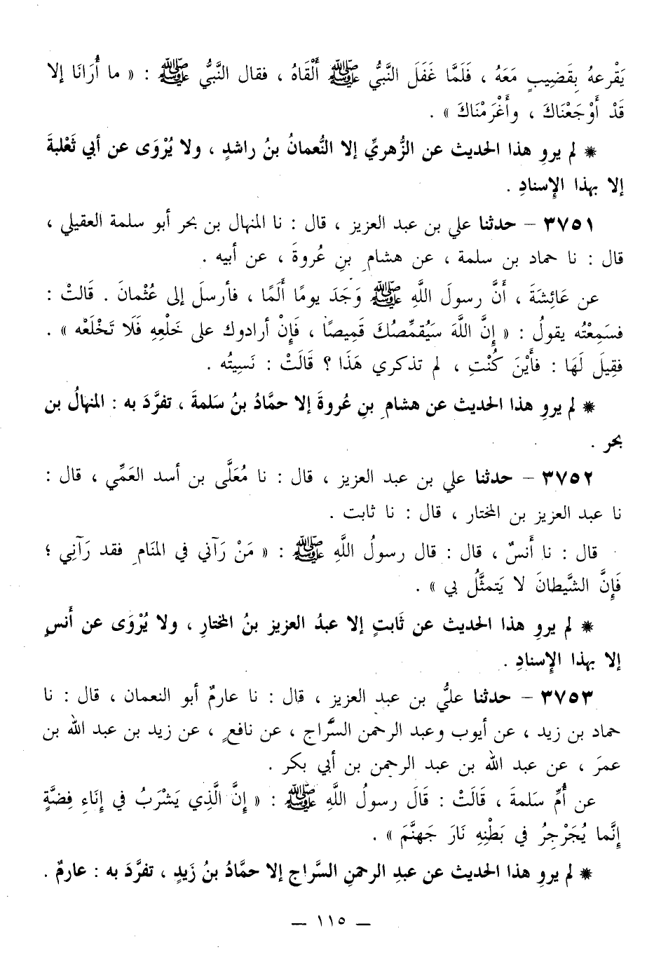 3751 - حَدَّثَنَا عَلِيُّ بْنُ عَبْدِ الْعَزِيزِ قَالَ: نا الْمِنْهَالُ بْنُ بَحْرٍ أَبُو سَلَمَةَ الْعُقَيْلِيُّ قَالَ: نا حَمَّادُ بْنُ سَلَمَةَ، عَنْ هِشَامِ بْنِ عُرْوَةَ، عَنْ أَبِيهِ، عَنْ عَائِشَةَ، أَنَّ رَسُولَ اللَّهِ صَلَّى اللهُ عَلَيْهِ وَسَلَّمَ وَجَدَ يَوْمًا أَلَمَا، فَأَرْسَلَ إِلَى عُثْمَانَ قَالَتْ: فَسَمِعْتُهُ يَقُولُ: «إِنَّ §اللَّهَ سَيُقْمِصُكَ قَمِيصًا فَإِنْ أَرَادُوكَ عَلَى خَلْعِهِ فَلَا تَخْلَعْهُ» فَقِيلَ لَهَا: فَأَيْنَ كُنْتِ، لَمْ تَذْكُرِي هَذَا؟ قَالَتْ: «نَسِيتُهُ»
