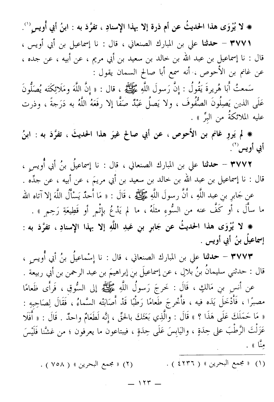 3771 - حَدَّثَنَا عَلِيُّ بْنُ الْمُبَارَكِ الصَّنْعَانِيُّ قَالَ: نا إِسْمَاعِيلُ بْنُ أَبِي أُوَيْسٍ قَالَ: نا إِسْمَاعِيلُ بْنُ عَبْدِ اللَّهِ بْنِ خَالِدِ بْنِ سَعِيدِ بْنِ أَبِي مَرْيَمَ، عَنْ أَبِيهِ، عَنْ جَدِّهِ، عَنْ غَانِمِ بْنِ الْأَحْوَصِ، أَنَّهُ سَمِعَ أَبَا صَالِحٍ السَّمَّانُ، يَقُولُ: سَمِعْتُ أَبَا هُرَيْرَةَ، يَقُولُ: إِنَّ رَسُولَ اللَّهِ صَلَّى اللهُ عَلَيْهِ وَسَلَّمَ قَالَ: «إِنَّ §اللَّهَ وَمَلَائِكَتَهُ يُصَلُّونَ عَلَى الَّذِينَ يَصِلُونَ الصُّفُوفَ، وَلَا يَصِلُ عَبْدٌ صَفًّا إِلَّا رَفَعَهُ اللَّهُ بِهِ دَرَجَةً، وَذَرَّتْ عَلَيْهِ الْمَلَائِكَةُ مِنَ الْبِرِّ»