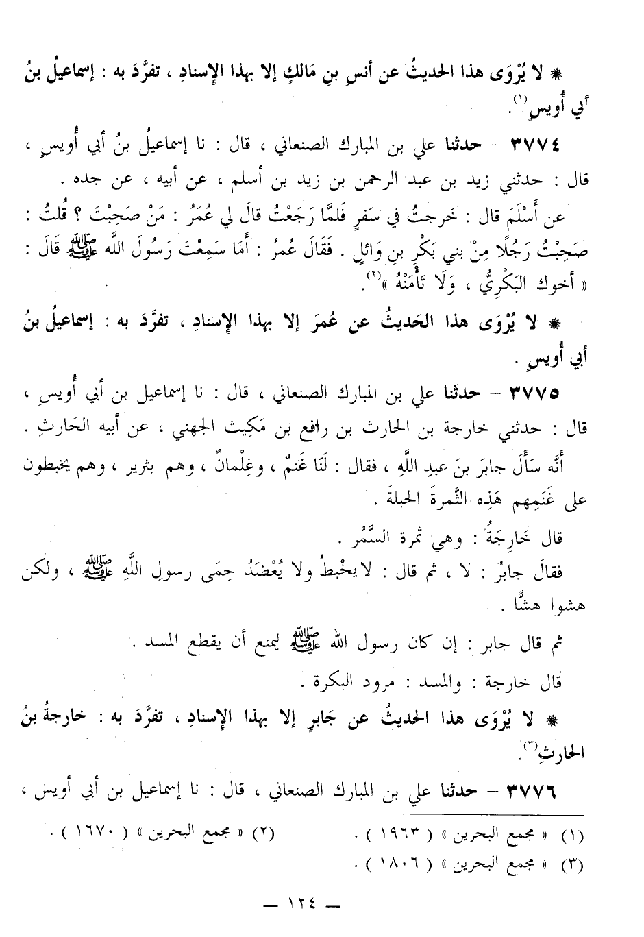 3775 - حَدَّثَنَا عَلِيُّ بْنُ الْمُبَارَكِ الصَّنْعَانِيُّ قَالَ: نا إِسْمَاعِيلُ بْنُ أَبِي أُوَيْسٍ قَالَ: حَدَّثَنِي خَارِجَةُ بْنُ الْحَارِثِ بْنِ رَافِعِ بْنِ مَكِيثٍ الْجُهَنِيُّ، عَنْ أَبِيهِ الْحَارِثِ، أَنَّهُ سَأَلَ جَابِرَ بْنَ عَبْدِ اللَّهِ: فَقَالَ لَنَا: «غَنَمٌ وَغِلْمَانٌ، وَهُمْ بِثُرَيْرٍ، وَهُمْ يَخْبِطُونَ عَلَى غَنَمِهِمْ هَذِهِ الثَّمَرَةَ الْحُبْلَةِ» قَالَ خَارِجَةُ: وَهِيَ ثَمَرَةُ السَّمُرِ، فَقَالَ جَابِرٌ: «لَا» ، ثُمَّ قَالَ: «لَا يُخْبَطُ، وَلَا يُعْضَدُ حِمَى رَسُولِ اللَّهِ صَلَّى اللهُ عَلَيْهِ وَسَلَّمَ، وَلَكِنْ هُشُّوا هَشًّا» ، ثُمَّ قَالَ جَابِرٌ: «إِنْ §كَانَ رَسُولُ اللَّهِ صَلَّى اللهُ عَلَيْهِ وَسَلَّمَ لَيَمْنَعُ أَنْ يُقْطَعَ الْمَسَدُ» قَالَ خَارِجَةُ: وَالْمَسَدُ مِرْوَدُ الْبَكَرَةِ «