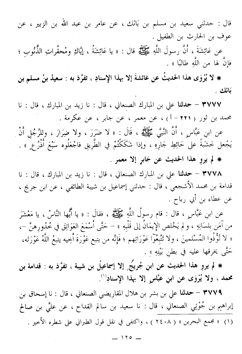 3778 - حَدَّثَنَا عَلِيُّ بْنُ الْمُبَارَكِ الصَّنْعَانِيُّ قَالَ: نا زَيْدُ بْنُ الْمُبَارَكِ قَالَ: نا قُدَامَةُ بْنُ مُحَمَّدٍ الْأَشْجَعِيُّ قَالَ: حَدَّثَنِي إِسْمَاعِيلُ بْنُ شَيْبَةَ الطَّائِفِيُّ، عَنِ ابْنِ جُرَيْجٍ، عَنْ عَطَاءِ بْنِ أَبِي رَبَاحٍ، عَنِ ابْنِ عَبَّاسٍ قَالَ: قَامَ رَسُولُ اللَّهِ صَلَّى اللهُ عَلَيْهِ وَسَلَّمَ فَقَالَ: «يَا أَيُّهَا النَّاسُ، يَا مَعْشَرَ مَنْ آمَنَ، بِلِسَانِهِ، وَلَمْ يُخْلِصِ الْإِيمَانَ إِلَى قَلْبِهِ» حَتَّى أَسْمَعَ الْعَوَاتِقَ فِي خُدُورِهِنَّ، «لَا تُؤْذُوا الْمُسْلِمِينَ، وَلَا تَتَّبِعُوا عَوْرَاتِهِمْ، فَإِنَّهُ §مَنْ يَتَّبِعْ عَوْرَةَ أَخِيهِ يَتَّبِعِ اللَّهُ عَوْرَتَهُ حَتَّى يَخْرِقَهَا عَلَيْهِ فِي بَطْنِ بَيْتِهِ»