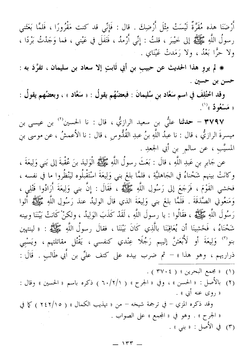 3797 - حَدَّثَنَا عَلِيُّ بْنُ سَعِيدٍ الرَّازِيُّ قَالَ: نا الْحُسَيْنُ بْنُ عِيسَى بْنِ مَيْسَرَةَ الرَّازِيُّ قَالَ: نا عَبْدُ اللَّهِ بْنُ عَبْدِ الْقُدُّوسِ قَالَ: نا الْأَعْمَشُ، عَنْ مُوسَى بْنِ الْمُسَيِّبِ، عَنْ سَالِمِ بْنِ أَبِي الْجَعْدِ، عَنْ جَابِرِ بْنِ عَبْدِ اللَّهِ قَالَ: بَعَثَ رَسُولُ اللَّهِ صَلَّى اللهُ عَلَيْهِ وَسَلَّمَ الْوَلِيدَ بْنَ عُقْبَةَ إِلَى بَنِي وَلِيعَةَ، وَكَانَتْ بَيْنَهُمْ شَحْنَاءُ فِي الْجَاهِلِيَّةِ، فَلَمَّا بَلَغَ بَنِي وَلِيعَةَ اسْتَقْبَلُوهُ لِيَنْظُرُوا مَا فِي نَفْسِهِ، فَخَشِيَ الْقَوْمَ فَرَجَعَ إِلَى رَسُولِ صَلَّى اللهُ عَلَيْهِ وَسَلَّمَ، فَقَالَ: إِنَّ بَنِي وَلِيعَةَ أَرَادُوا قَتْلِي، وَمَنَعُونِي الصَّدَقَةَ فَلَمَّا بَلَغَ بَنِي وَلِيعَةَ الَّذِي قَالَ الْوَلِيدُ: عِنْدَ رَسُولِ اللَّهِ صَلَّى اللهُ عَلَيْهِ وَسَلَّمَ أَتَوْا رَسُولَ صَلَّى اللهُ عَلَيْهِ وَسَلَّمَ، فَقَالُوا: يَا رَسُولَ اللَّهِ، لَقَدْ كَذَبَ الْوَلِيدُ، وَلَكِنْ كَانَتْ بَيْنَنَا وَبَيْنَهُ شَحْنَاءُ، فَخَشِينَا أَنْ يُعَاقِبَنَا بِالَّذِي كَانَ بَيْنَنَا، فَقَالَ رَسُولُ اللَّهِ صَلَّى اللهُ عَلَيْهِ وَسَلَّمَ: «§لَيَنْتَهِيَنَّ بَنُو وَلِيعَةَ أَوْ لَأَبْعَثَنَّ إِلَيْهِمْ رَجُلًا عِنْدِي كَنَفْسِي يَقْتُلُ مُقَاتِلَتَهُمْ وَيَسْبِي ذَرَارِيَّهُمْ، وَهُوَ هَذَا» ثُمَّ ضَرَبَ بِيَدِهِ عَلَى كَتِفِ عَلِيِّ بْنِ أَبِي طَالِبٍ قَالَ: