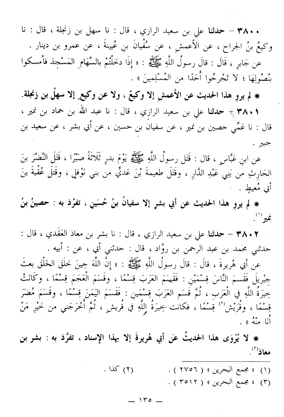 3801 - حَدَّثَنَا عَلِيُّ بْنُ سَعِيدٍ الرَّازِيُّ قَالَ: نا عَبْدُ اللَّهِ بْنُ حَمَّادِ بْنِ نُمَيْرٍ قَالَ: نا عَمِّي حُصَيْنُ بْنُ نُمَيْرٍ، عَنْ سُفْيَانَ بْنِ حُسَيْنٍ، عَنْ أَبِي بِشْرٍ، عَنْ سَعِيدِ بْنِ جُبَيْرٍ، عَنِ ابْنِ عَبَّاسٍ قَالَ: «§قَتَلَ رَسُولُ اللَّهِ صَلَّى اللهُ عَلَيْهِ وَسَلَّمَ يَوْمَ بَدْرٍ ثَلَاثَةً صَبْرًا، قَتَلَ النَّضْرَ بْنَ الْحَارِثِ مِنْ بَنِي عَبْدِ الدَّارِ، وَقَتَلَ طُعَيْمَةَ بْنَ عَدِيٍّ مِنْ بَنِي نَوْفَلٍ، وَقَتَلَ عُقْبَةَ بْنَ أَبِي مُعَيْطٍ»