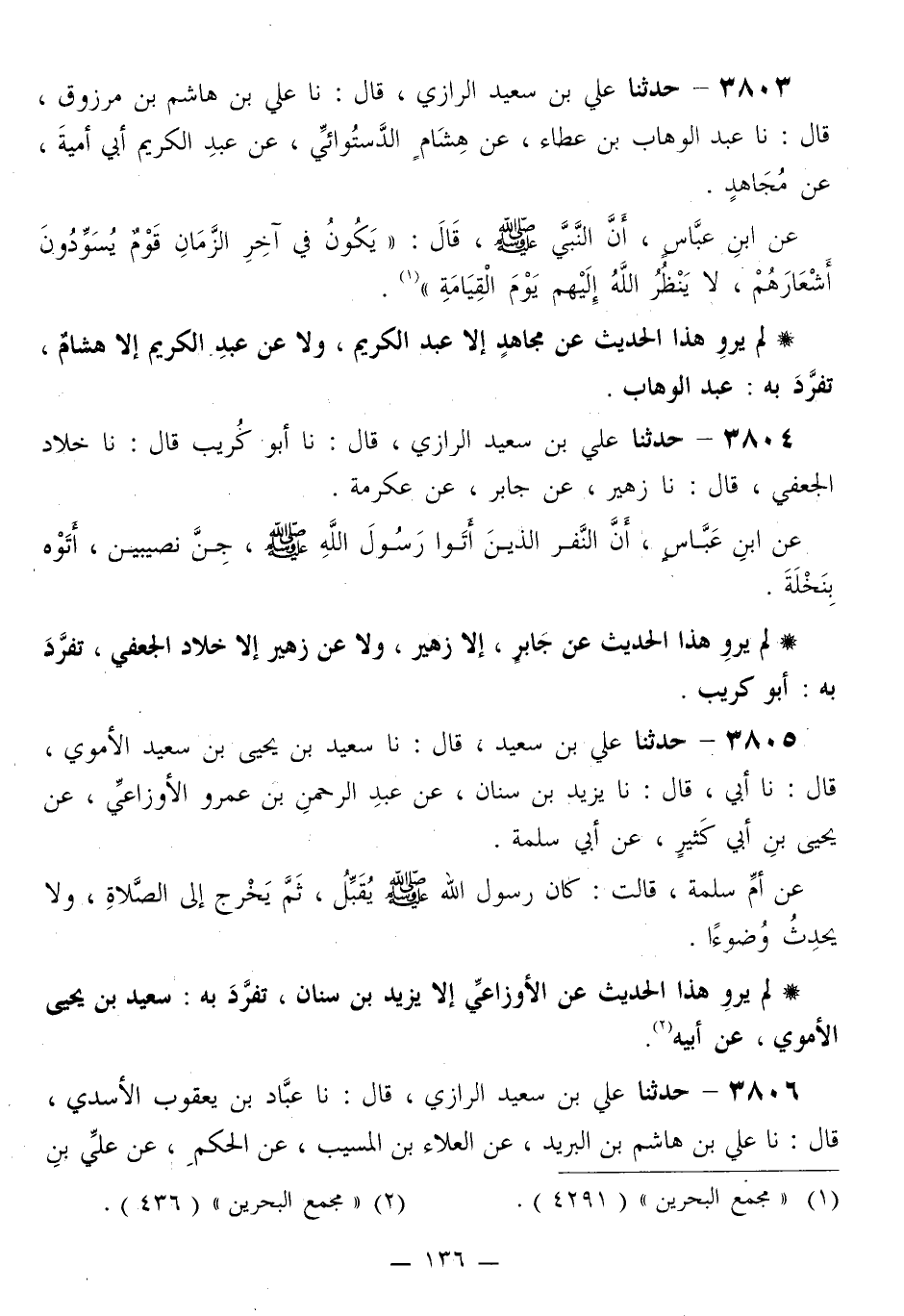 3803 - حَدَّثَنَا عَلِيُّ بْنُ سَعِيدٍ الرَّازِيُّ قَالَ: نا عَلِيُّ بْنُ هَاشِمِ بْنِ مَرْزُوقٍ قَالَ: نا عَبْدُ الْوَهَّابِ بْنُ عَطَاءٍ، عَنْ هِشَامٍ الدَّسْتَوَائِيِّ، عَنْ عَبْدِ الْكَرِيمِ أَبِي أُمَيَّةَ، عَنْ مُجَاهِدٍ، عَنِ ابْنِ عَبَّاسٍ، أَنَّ النَّبِيَّ صَلَّى اللهُ عَلَيْهِ وَسَلَّمَ قَالَ: «§يَكُونُ فِي آخِرِ الزَّمَانِ قَوْمٌ يُسَوِّدُونَ أَشْعَارَهُمْ، لَا يَنْظُرُ اللَّهُ إِلَيْهِمْ يَوْمَ الْقِيَامَةِ»