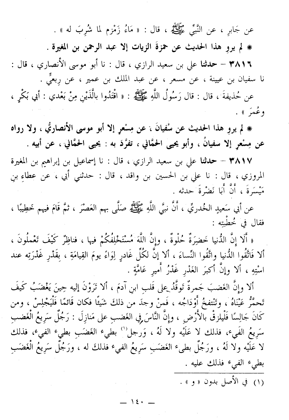 3817 - حَدَّثَنَا عَلِيُّ بْنُ سَعِيدٍ الرَّازِيُّ قَالَ: نا إِسْمَاعِيلُ بْنُ إِبْرَاهِيمَ بْنِ الْمُغِيرَةِ الْمَرْوَزِيُّ قَالَ: نا عَلِيُّ بْنُ الْحُسَيْنِ بْنِ وَاقِدٍ قَالَ: حَدَّثَنِي أَبِي، عَنْ عَطَاءِ بْنِ مَيْسَرَةَ، أَنَّ أَبَا نَضْرَةَ، حَدَّثَهُ، عَنْ أَبِي سَعِيدٍ الْخُدْرِيِّ: أَنَّ نَبِيَّ اللَّهِ صَلَّى اللهُ عَلَيْهِ وَسَلَّمَ صَلَّى بِهِمُ الْعَصْرَ، ثُمَّ قَامَ فِيهِمْ خَطِيبًا، فَقَالَ فِي خُطْبَتِهِ: «أَلَا إِنَّ §الدُّنْيَا خَضِرَةٌ حُلْوَةٌ، وَإِنَّ اللَّهَ مُسْتَخْلِفُكُمْ فِيهَا، فَنَاظِرٌ كَيْفَ تَعْمَلُونَ، أَلَا فَاتَّقُوا الدُّنْيَا وَاتَّقُوا النِّسَاءَ، إِلَّا إِنَّ لِكُلِّ غَادِرٍ لِوَاءً يَوْمَ الْقِيَامَةِ، بِقَدْرِ غَدْرَتِهِ عِنْدَ اسْتِهِ، إِلَّا وَإِنَّ أَكْبَرَ الْغَدْرِ غَدْرُ أَمِيرِ عَامَّةٍ إِلَّا وَإِنَّ الْغَضَبَ جَمْرَةٌ تُوقَدُ عَلَى قَلْبِ ابْنِ آدَمَ، أَلَا تَرَوْنَ إِلَيْهِ حِينَ يَغْضَبُ كَيْفَ تَحَمِّرُ عَيْنَاهُ، وَتَنْتَفِخُ أَوْدَاجُهُ، فَمَنْ وَجَدَ مِنْ ذَلِكَ شَيْئًا فَكَانَ قَائِمًا فَلْيَجْلِسْ، وَمَنْ كَانَ جَالِسًا فَلْيَلْزَقْ بِالْأَرْضِ، وَإِنَّ النَّاسَ فِي الْغَضَبِ عَلَى مَنَازِلَ: رَجُلٌ سَرِيعُ الْغَضَبِ سَرِيعُ الْفَيْءِ فَذَلِكَ لَا عَلَيْهِ وَلَا لَهُ، وَرَجُلٌ بَطِيءُ الْغَضَبٍ بَطِيءُ الْفَيْءِ، فَذَلِكَ لَا عَلَيْهِ وَلَا لَهُ، وَرَجُلٌ بَطِيءُ الْغَضَبِ سَرِيعُ الْفَيْءِ فَذَلِكَ لَهُ، وَرَجُلٌ سَرِيعُ الْغَضَبِ بَطِيءٌ الْفَيْءِ فَذَلِكَ عَلَيْهِ، -[141]- أَلَا إِنَّ ابْنَ آدَمَ خُلِقَ عَلَى أَطْوَارٍ: يُخْلَقُ الْعَبْدُ مُؤْمِنًا، وَيَعِيشُ مُؤْمِنًا، وَيَمُوتُ مُؤْمِنًا، وَيُخْلَقُ الْعَبْدُ كَافِرًا وَيَعِيشُ كَافِرًا، وَيَمُوتُ كَافِرًا، وَيُخْلَقُ مُؤْمِنًا، وَيَعِيشُ مُؤْمِنًا، وَيَمُوتُ كَافِرًا، وَيُخْلَقُ كَافِرًا، وَيَعِيشُ كَافِرًا، وَيَمُوتُ مُؤْمِنًا» وَذَكَرَ «أَنَّ النَّاسَ فِي الطَّلَبِ عَلَى مَنَازِلَ: يَكُونُ الرَّجُلُ إِذَا طَلَبَ اشْتَدَّ، وَإِذَا طُلِبَ قَضَى، فَتِلْكَ بِتِلْكَ، وَيَكُونُ الرَّجُلُ إِذَا طَلَبَ حَبَسَ، إِذَا طُلِبَ أُخِذَ، فَتِلْكَ بِتِلْكَ، وَيَكُونُ الرَّجُلُ إِذَا طَلَبَ حَبَسَ وَأَخَذَ، وَإِذَا طُلِبَ قَضَى، فَهُوَ خَيْرٌ لَهُ، وَيَكُونُ الرَّجُلُ إِذَا طَلَبَ يَحْبِسُ، وَإِذَا طُلِبَ لَوَى، فَهُوَ شَرٌّ لَهُ، أَلَا هَلْ عَسَى أَحَدُكُمْ أَنْ يَرَى مُنْكَرًا فَلَا يُغَيِّرُهُ، أَلَا وَإِنَّهُ قَدْ مَضَى بَيْنَ أَيْدِيكُمْ تِسْعٌ وَسِتُّونَ أُمَّةً، وَأَنْتُمْ تُوفُونَ سَبْعِينَ، أَلَا وَإِنَّ مَا مَضَى مِنَ الدُّنْيَا فِيمَا بَقِيَ كَمَا مَضَى مِنْ يَوْمِكُمْ هَذَا فِيمَا بَقِيَ، وَذَلِكَ حِينَ اصْفَرَّتِ الشَّمْسُ وَتَغِيبُ»