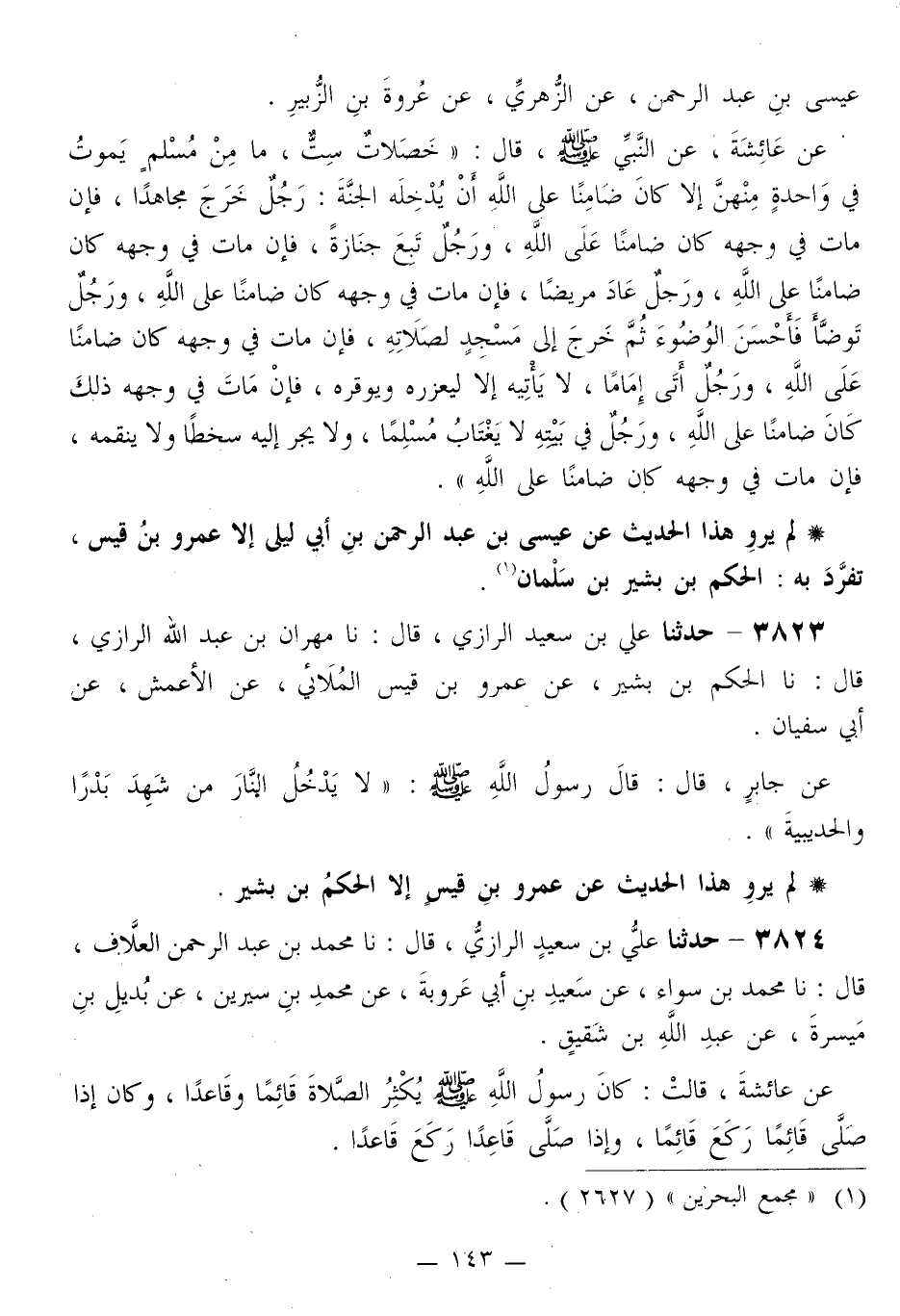 عِيسَى بْنِ عَبْدِ الرَّحْمَنِ، عَنِ الزُّهْرِيِّ، عَنْ عُرْوَةَ بْنِ الزُّبَيْرِ، عَنْ عَائِشَةَ، عَنِ النَّبِيِّ صَلَّى اللهُ عَلَيْهِ وَسَلَّمَ قَالَ: «§خَصَلَاتٌ سِتٌّ، مَا مِنْ مُسْلِمٍ يَمُوتُ فِي وَاحِدَةٍ مِنْهُنَّ، إِلَّا كَانَ ضَامِنًا عَلَى اللَّهِ أَنْ يُدْخِلَهُ الْجَنَّةَ: رَجُلٌ خَرَجَ مُجَاهِدًا، فَإِنْ مَاتَ فِي وَجْهِهِ كَانَ ضَامِنًا عَلَى اللَّهِ، وَرَجُلٌ تَبِعَ جَنَازَةً، فَإِنْ مَاتَ فِي وَجْهِهِ كَانَ ضَامِنًا عَلَى اللَّهِ، وَرَجُلٌ عَادَ مَرِيضًا، فَإِنْ مَاتَ فِي وَجْهِهِ كَانَ ضَامِنًا عَلَى اللَّهِ، وَرَجُلٌ تَوَضَّأَ فَأَحْسَنَ الْوُضُوءَ ثُمَّ خَرَجَ إِلَى مَسْجِدٍ لِصَلَاتِهِ، فَإِنْ مَاتَ فِي وَجْهِهِ كَانَ ضَامِنًا عَلَى اللَّهِ، وَرَجُلٌ أَتَى إِمَامًا، لَا يَأْتِيهِ إِلَّا لِيُعَزِّرَهُ وَيُوَقِّرَهُ، فَإِنْ مَاتَ فِي وَجْهِهِ ذَلِكَ كَانَ ضَامِنًا عَلَى اللَّهِ، وَرَجُلٌ فِي بَيْتِهِ لَا يَغْتَابُ مُسْلِمًا، وَلَا يَجُرُّ إِلَيْهِ سَخَطًا وَلَا يَنْقِمُهُ، فَإِنْ مَاتَ فِي وَجْهِهِ كَانَ ضَامِنًا عَلَى اللَّهِ»
