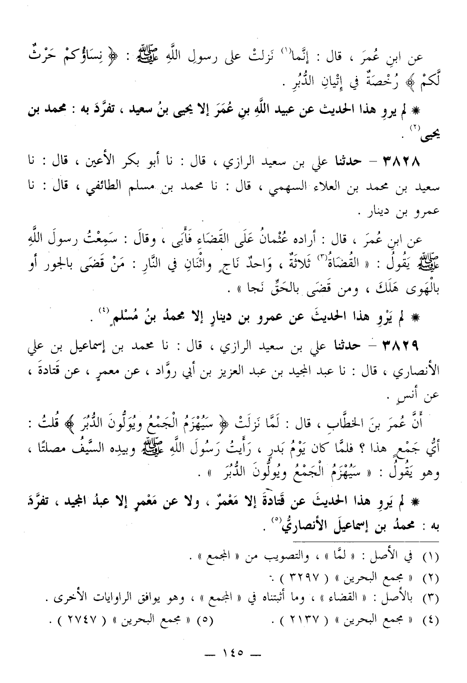 3829 - حَدَّثَنَا عَلِيُّ بْنُ سَعِيدٍ الرَّازِيُّ قَالَ: نا مُحَمَّدُ بْنُ إِسْمَاعِيلَ بْنِ عَلِيٍّ الْأَنْصَارِيُّ قَالَ: نا عَبْدُ الْمَجِيدِ بْنُ عَبْدِ الْعَزِيزِ بْنِ أَبِي رَوَّادٍ، عَنْ مَعْمَرٍ، عَنْ قَتَادَةَ، عَنْ أَنَسٍ، أَنَّ عُمَرَ بْنَ الْخَطَّابِ قَالَ: لَمَّا نَزَلَتْ {سَيُهْزَمُ الْجَمْعُ وَيُوَلُّونَ الدُّبُرَ} [القمر: 45] قُلْتُ: أَيُّ جَمْعٍ هَذَا؟ فَلَمَّا كَانَ يَوْمَ بَدْرٍ، رَأَيْتُ رَسُولَ اللَّهِ صَلَّى اللهُ عَلَيْهِ وَسَلَّمَ وَبِيَدِهِ السَّيْفُ مُصْلِتًا، وَهُوَ يَقُولُ: « {§سَيُهْزَمُ الْجَمْعُ وَيُوَلُّونَ الدُّبُرَ} [القمر: 45] »