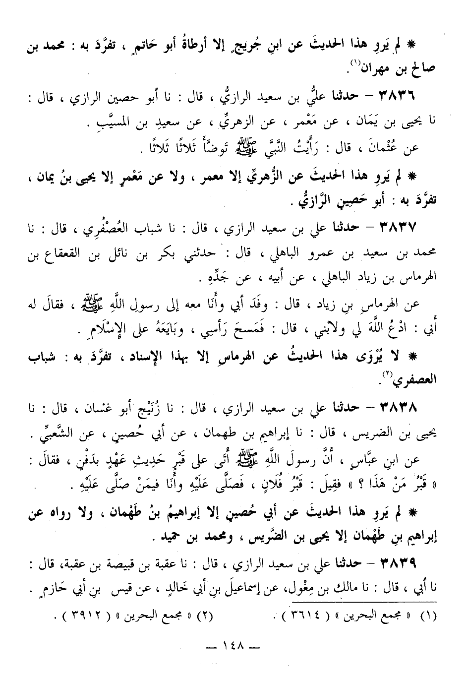 لَمْ يَرْوِ هَذَا الْحَدِيثَ عَنْ أَبِي حُصَيْنٍ إِلَّا إِبْرَاهِيمُ بْنُ طَهْمَانَ، وَلَا رَوَاهُ عَنْ إِبْرَاهِيمَ بْنِ طَهْمَانَ إِلَّا يَحْيَى بْنُ الضُّرَيْسِ، وَمُحَمَّدُ بْنُ حُمَيْدٍ»