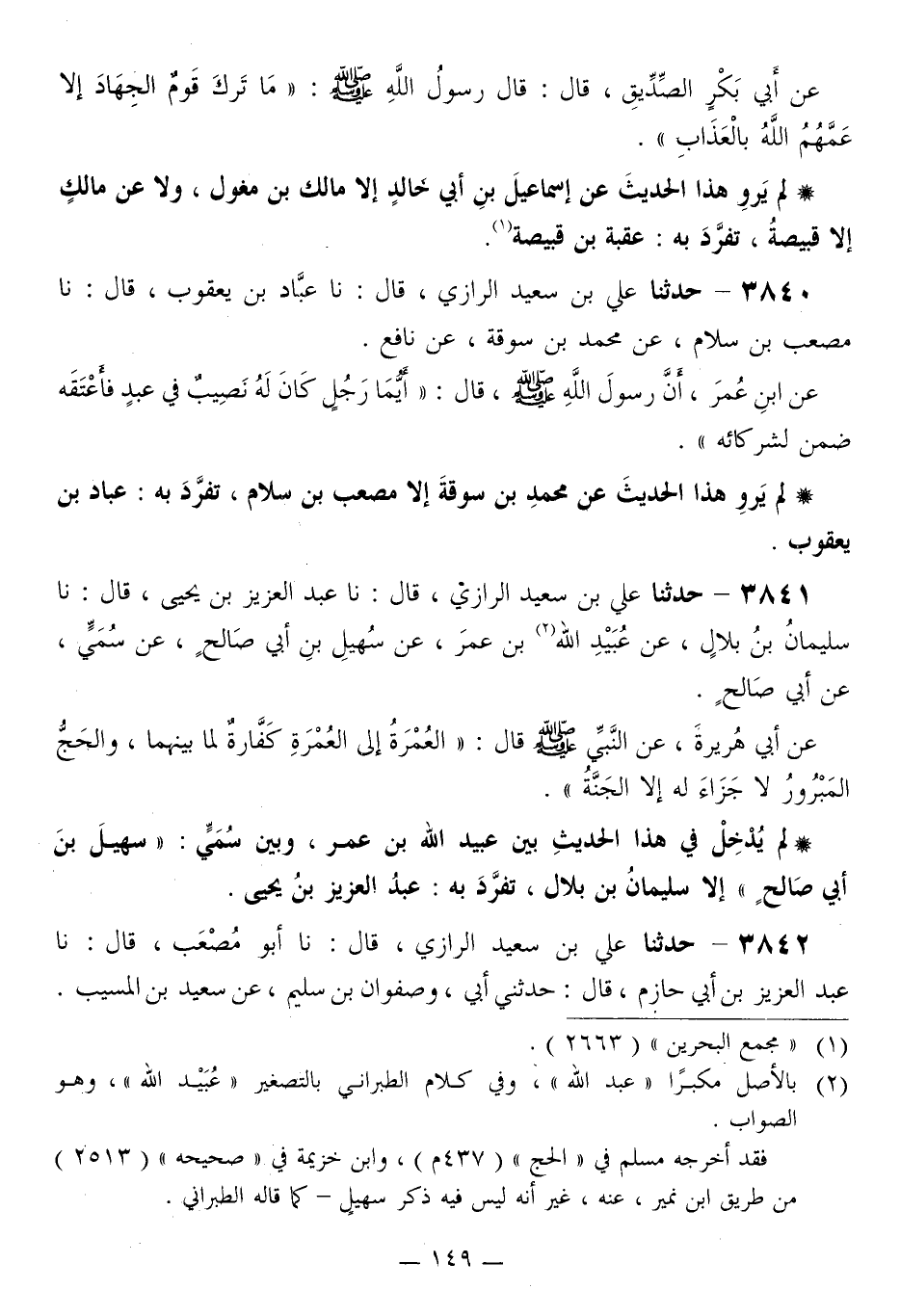 3841 - حَدَّثَنَا عَلِيُّ بْنُ سَعِيدٍ الرَّازِيُّ قَالَ: نا عَبْدُ الْعَزِيزِ بْنُ يَحْيَى قَالَ: نا سُلَيْمَانُ بْنُ بِلَالٍ، عَنْ عُبَيْدِ اللَّهِ بْنِ عُمَرَ، عَنْ سُهَيْلِ بْنِ أَبِي صَالِحٍ، عَنْ سُمَيٍّ، عَنْ أَبِي صَالِحٍ، عَنْ أَبِي هُرَيْرَةَ، عَنِ النَّبِيِّ صَلَّى اللهُ عَلَيْهِ وَسَلَّمَ قَالَ: «§الْعُمْرَةُ إِلَى الْعُمْرَةِ كَفَّارَةٌ لِمَا بَيْنَهُمَا، وَالْحَجُّ الْمَبْرُورُ لَا جَزَاءَ لَهُ إِلَّا الْجَنَّةُ» لَمْ يَدْخُلْ فِي هَذَا الْحَدِيثِ بَيْنَ عُبَيْدِ اللَّهِ بْنِ عُمَرَ، وَبَيْنَ سُمَيٍّ سُهَيْلُ بْنُ أَبِي صَالِحٍ إِلَّا سُلَيْمَانُ بْنُ بِلَالٍ، تَفَرَّدَ بِهِ: عَبْدُ الْعَزِيزِ بْنُ يَحْيَى "