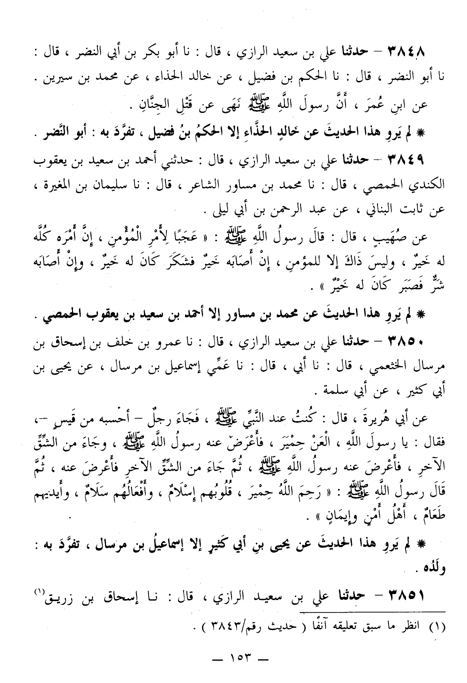 3849 - حَدَّثَنَا عَلِيُّ بْنُ سَعِيدٍ الرَّازِيُّ قَالَ: حَدَّثَنِي أَحْمَدُ بْنُ سَعِيدِ بْنِ يَعْقُوبَ الْكِنْدِيُّ الْحِمْصِيُّ قَالَ: نا مُحَمَّدُ بْنُ مُسَاوِرٍ الشَّاعِرُ قَالَ: نا سُلَيْمَانُ بْنُ الْمُغِيرَةِ، عَنْ ثَابِتٍ الْبُنَانِيِّ، عَنْ عَبْدِ الرَّحْمَنِ بْنِ أَبِي لَيْلَى، عَنْ صُهَيْبٍ قَالَ: قَالَ رَسُولُ اللَّهِ صَلَّى اللهُ عَلَيْهِ وَسَلَّمَ: «§عَجَبًا لِأَمْرِ الْمُؤْمِنِ، إِنَّ أَمْرَهُ كُلَّهُ لَهُ خَيْرٌ، وَلَيْسَ ذَاكَ إِلَّا لِلْمُؤْمِنِ، إِنْ أَصَابَهُ خَيْرٌ فَشَكَرَ كَانَ لَهُ خَيْرٌ، وَإِنْ أَصَابَهُ شَرٌّ فَصَبَرَ كَانَ لَهُ خَيْرٌ»